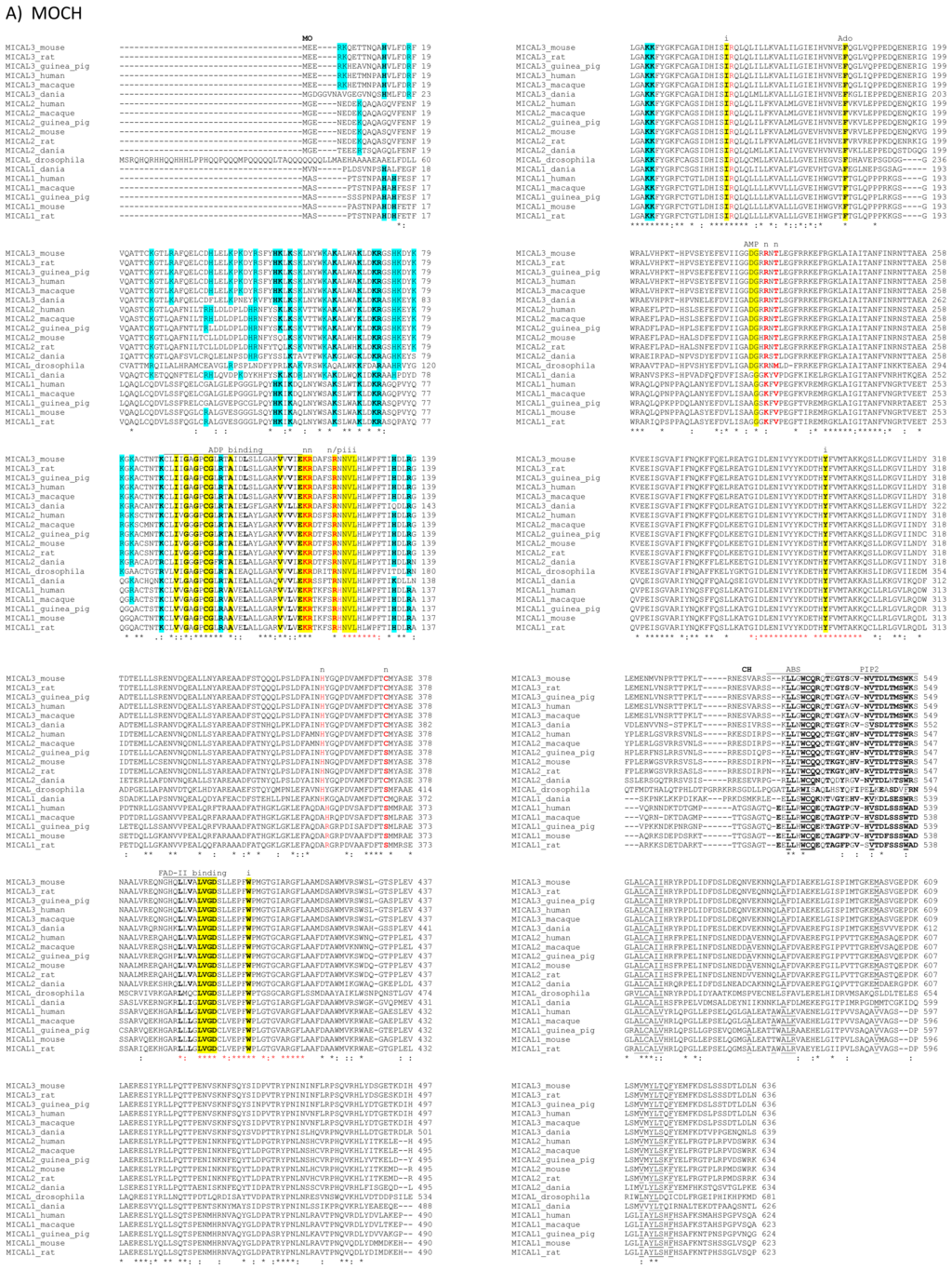 In the N-terminal segment (~80 residues), some residues are conserved in all MICALs. Other residues are only conserved within each MICAL 1–3 class and may be diagnostic for the classification of MICAL forms. Drosophila MICAL contains an ≈40 residues N-terminal extension with respect to mammalian MICALs. However, it is not a distinctive feature of insects MICALs, for which most of the sequences in databanks are not complete.