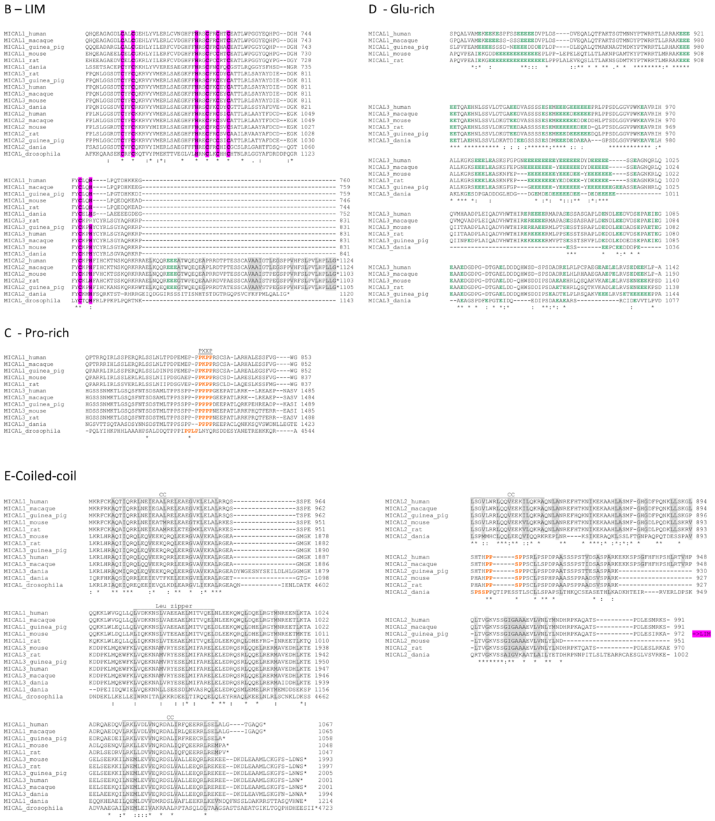 In the C-terminal region, a Pro-rich region matching the PXXP motif typical of proteins that interact with SH3 domains is found in MICAL1 [] and MICAL3 only (Figure 4C). However, a Pro-rich region possibly matching the PXXP consensus sequence is actually found also in MICAL2, but in the region containing the putative coiled-coil motifs (Figure 4E). MICAL1 and 3 exhibit Glu (and Asp)-rich regions of different length (Figure 4D). They may also contribute to protein-protein interactions, but their precise role in MICALs is not known. In MICAL2, a Glu-rich region is found in the C-terminal protein segment following the LIM domain, but it is very short and is unlikely to play a specific role (Figure 4B).