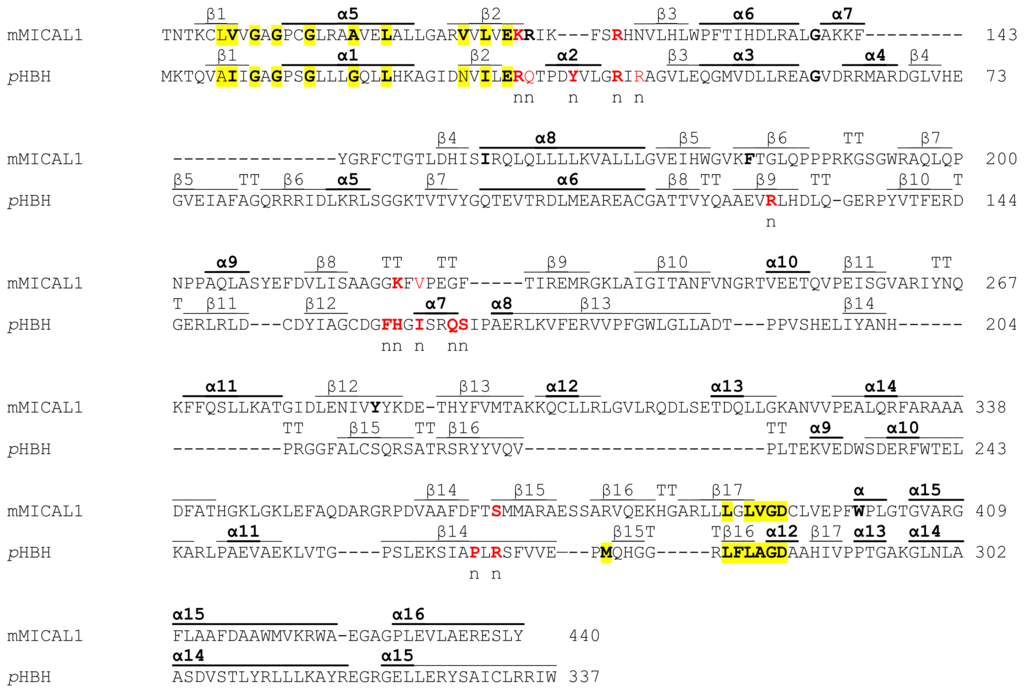 Comparison between mouse MICAL and p-hydroxybenzoate hydroxylase. The 83–440 region of mouse MICAL1 is compared with full-length Pseudomonas fluorescens p-hydroxybenzoate hydroxylase. The alignment takes into account the known three-dimensional structures of the proteins (2BRA [], 2BRY [] for mouse MICAL; 1PBE [] for PHBH) as in [,]. The secondary structure elements (β strands, α helices and β turns (TT) are indicated above each sequence. The conserved residues in the consensus sequence for the formation of the binding site of the adenylate portion of FAD [] and the second FAD consensus sequence of Eggink et al. [] are colored yellow. The residues that in PHBH are implicated in NADPH binding [] are indicated in red and with “n”. If they are conserved in equivalent positions in all MICALs (see Figure 4) they are in red in both sequences. Ser368 (conserved as S or C in all MICAL sequences) proposed to be equivalent to Arg269 of PHBH [] is also indicated.