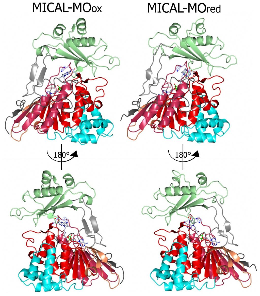 Comparison of the structures of MICAL1 monooxygenase domain. The structures of the “as isolated” mouse MICAL1 monooxygenase domain in the oxidized (“flavin out”) state (2BRY, chain A, MICAL-MOox) and of the NADPH-reduced (“flavin in”) species (2C4C, chain A, MICAL-MOred) as determined by Siebold et al. [] are shown in two orientations. Color scheme is as follows: blue, residues 1–85; red, residues 86–177, 208–217; coral, 178–208; grey, 218–237 (β9) and 366–375 (β15); green, 238–365; dark red, 376–442; dark grey, 443–489. FAD, Trp400 and Asn123 are shown in sticks with carbon in light grey, nitrogen in blue, oxygen atom in red and phosphorus in green. The CCP4MG program was used to generate the figure [].