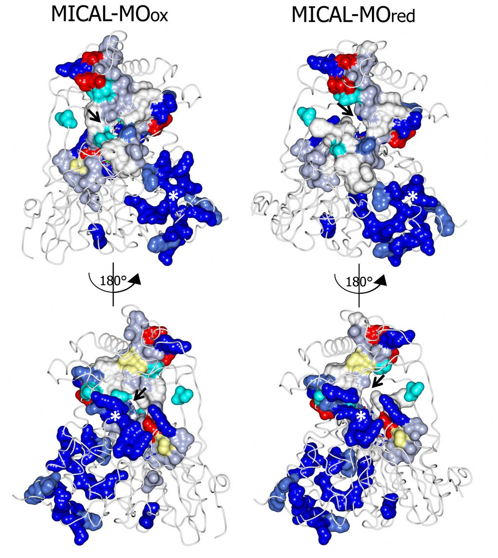 As discussed below, the MICAL flavoprotein-like domain actually exhibits a NAD(P)H oxidase activity, which would be consistent with the hypothesis. As an alternative, the small molecule being oxidized by MICAL would be the actual effector, but no evidence in support of this hypothesis is available. Finally, MICAL could covalently modify, through oxidation or hydroxylation, a protein side chain, leading to a modulation of its function. As discussed below, on the basis of the structure of MICAL’s N-terminal region [,] and of experimental evidence, actin [,] and the collapsin responsive mediator protein-1 (CRMP1) [] may be good candidates as the protein substrates.