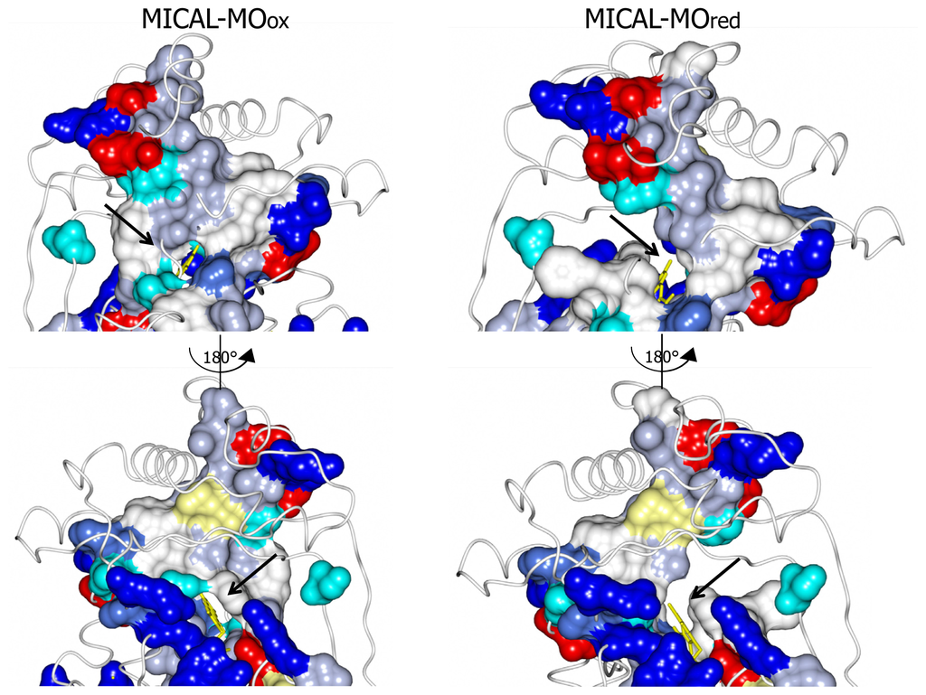 Comparison of the “flavin out” (MICAL-MOox) and “flavin in” (MICAL-MOred) conformations of MICAL-MO highlighting the conserved residues forming the putative NADPH binding site and the tunnel leading to the active site in the “flavin in” conformation. The stars mark the positively charged residues (in spheres) in the N-terminal protein region (top panels) and those in the putative NADPH binding site (lower panels; see Figures 4 and 5). The residues in the conserved regions surrounding the FAD isoalloxazine ring (arrows) and comprising residues 121–130, 278–300 and 390–405 (red stars in Figure 4) are shown. Color code is: light grey, Phe, Tyr, Trp; grey, Gly, Ala, Val, Leu, Ile; cyan, Ser, Thr, Gln, Asn; light yellow, Cys, Met; blue, Arg, Lys, His; red, Asp, Glu. The view is similar to that in Figure 6 to highlight the formation of the tunnel leading from the protein surface to the isoalloxazine ring in the “flavin in” (right) conformation. The CCP4MG program was used to generate the figure [].