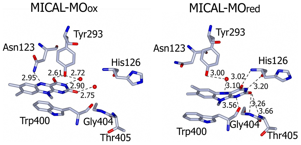 The three water molecules interacting with the flavin N(1), O(2), N(3) and the ribityl 2′OH are displaced with their position occupied by the FAD pyrimidine ring, which now interacts with His126 main chain amide and carbonyl groups, Gly404 and Thr405 (Figure 9). Tyr293 side chain hydroxyl group now interacts through a water molecule with the FAD N(5) position. The ring stacking interaction between the flavin isoalloxazine ring and Trp400 side-chain is lost, but Trp400 main chain oxygen atom is at hydrogen bonding distance from the reduced FAD N(5) atom (Figure 9). It has been proposed [] that the loss of hydrogen bonding interaction between Tyr293 of the substrate binding domain and FAD O(4) upon flavin reduction may trigger the conformational switch from the “flavin out” to the “flavin in” state. The latter is accompanied by conformational changes of the polypeptide chain with changes in secondary structure elements in the substrate binding domain (compare Figures 6 and 7 left and right panels). The 6.5° difference in the relative position of the FAD and substrate binding domains of oxidized and reduced MICAL is larger than that observed in PHBH due to the simpler topology of MICAL as compared to PHBH. The β sheet formed by β9 and β15 connecting the FAD and the substrate binding domain has been proposed to act as a hinge during domains reorientation [].