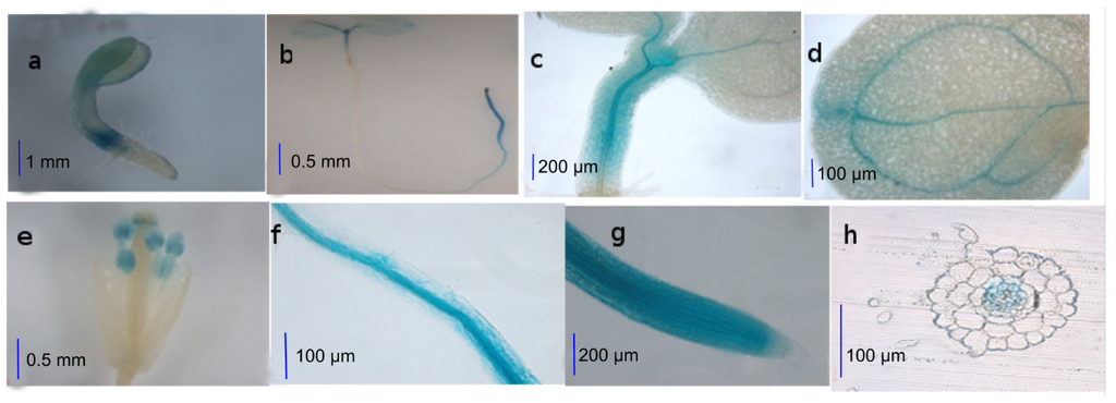 - Jefferson, R.A; Kavanagh, T.A; Bevan, M.W. GUS fusions: beta-glucuronidase as a sensitive and versatile gene fusion marker in higher plants. EMBO J. 1987, 6, 3901–3907. [Google Scholar]