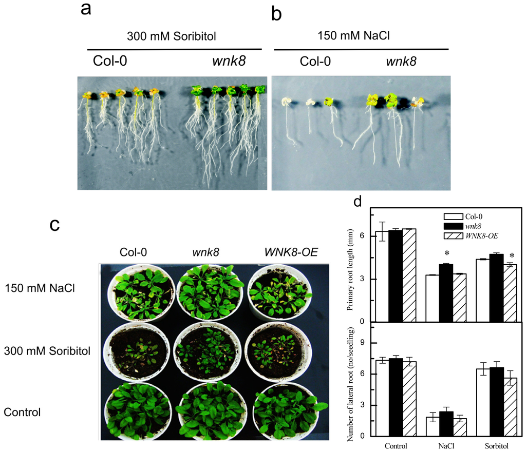 For sterilized media growth, seeds of wild-type, wnk8, and WNK8-OE were surface sterilized with 70% ethanol for 1 min and then with 10% bleach for 5 min before being washed five times with sterilized water. The seeds were germinated and grown on vertically placed petri dishes containing sterilized half strength MS media (pH 5.7), as described in Wang et al. (2008) [13]. Uniform 3-day-old plants were transplanted into 1/2 MS media supplemented with NaCl or sorbitol at indicated concentrations and grown for the indicated time. For taking pictures to indicate the differences between lines, seedlings were treated with NaCl for 10 days or with sorbitol for 30 days.
