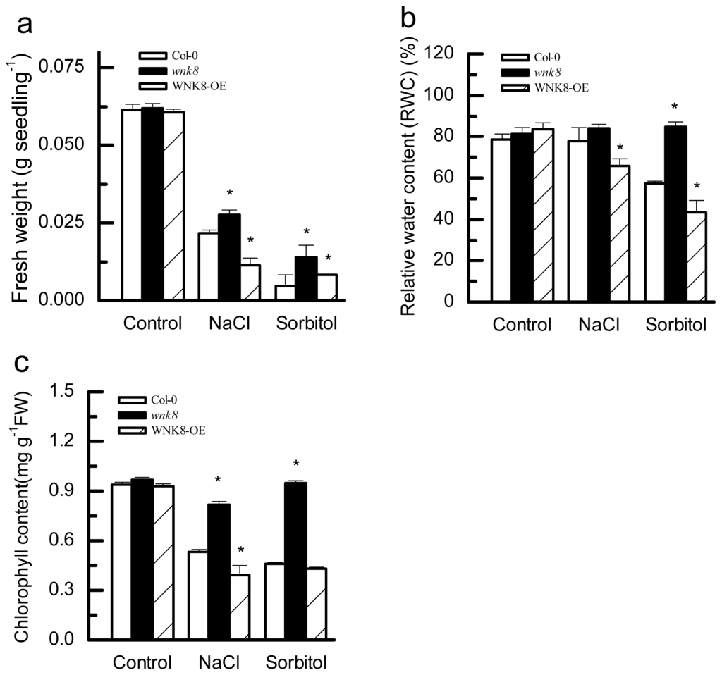As shown in Figure 4a, under normal growth conditions, there were no significant differences among Col-0, wnk8 and WNK8-OE, as indicated by FW. By contrast, salt and osmotic stresses significantly inhibited growth of Col-0, wnk8 and WNK8-OE, resulting in less FW. Under salt stress conditions, the FW of WNK8 was the highest, followed by Col-0 and WNK8-OE, and the FW of WNK8 was 1.27-times that of Col-0 (p < 0.05). Under osmotic stress conditions, the FW of wnk8 was 2.98-times that of Col-0 (p < 0.05).