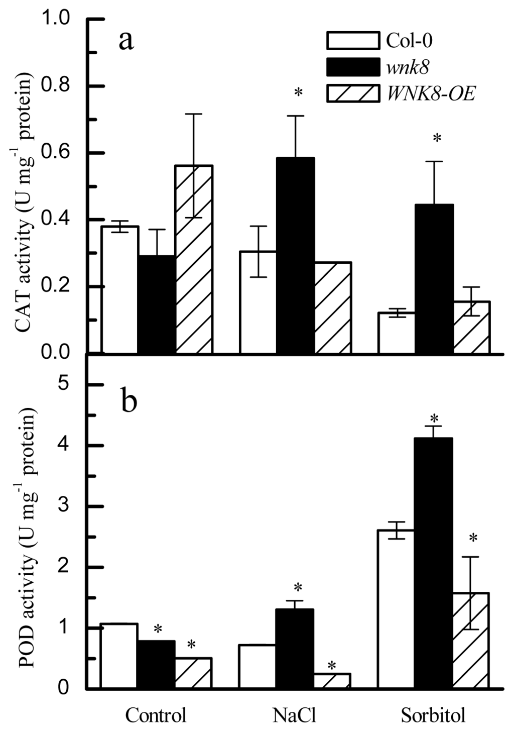 The ability to scavenge ROS in a short time is crucial for plants to tolerate stress and survive. Antioxidative CAT and POD are important enzymes for quenching ROS in plants [29]. As shown in Figure 6a, under control conditions, no difference of CAT activity among Col-0, wnk8 and WNK8-OE can be found. However, under salt stress, the WNK8 mutant had 1.92-fold higher CAT activity than Col-0, but no difference between Col-0 and WNK8-OE. When subjected to sorbitol stress, the activity of CAT in wnk8 mutant was 3.66-fold of that in the wild-type (p < 0.05), but the difference between Col-0 and WNK8-OE was insignificant (p > 0.05, Figure 6a). We noticed that both salt and sorbitol treatments significantly increased CAT activity in WNK8.