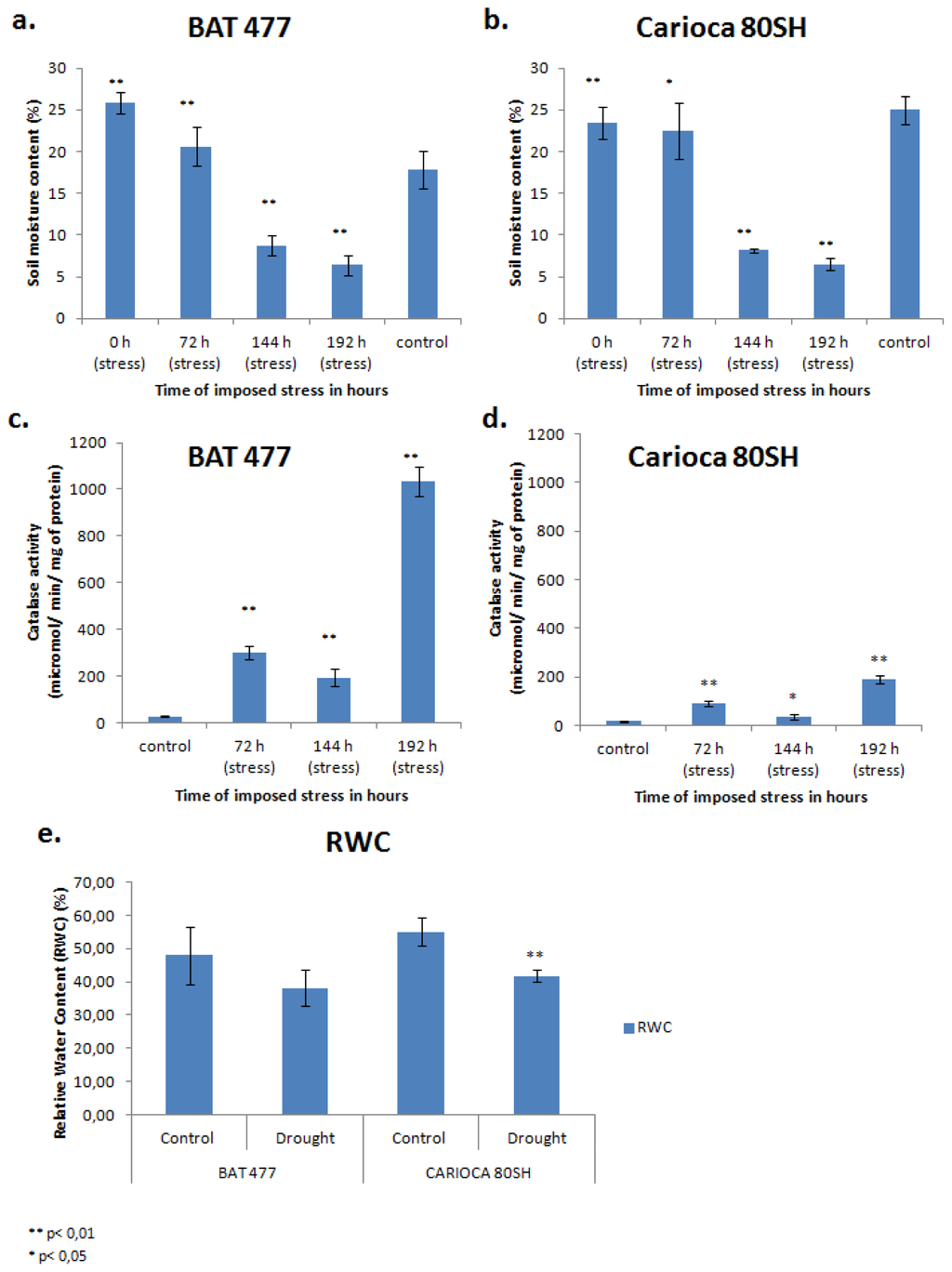 As can be inferred by Figure 1c,d, the expected increase in catalase activity in our leaves was achieved for both genotypes during the days of treatment, confirming the physiological state of the plants due to the drought. This increase in catalase activity was around three times higher in leaves of BAT 477 than in Carioca 80SH for the first 72 h of water deficit, and, by the end of the experiment (after 192 h), 5.5 times higher. These results may also represent a plausibly important differentiation in the drought-stress response between genotypes, since the fold change in catalase activity for Carioca 80SH was 200, while BAT 477 showed a 1100 fold change.