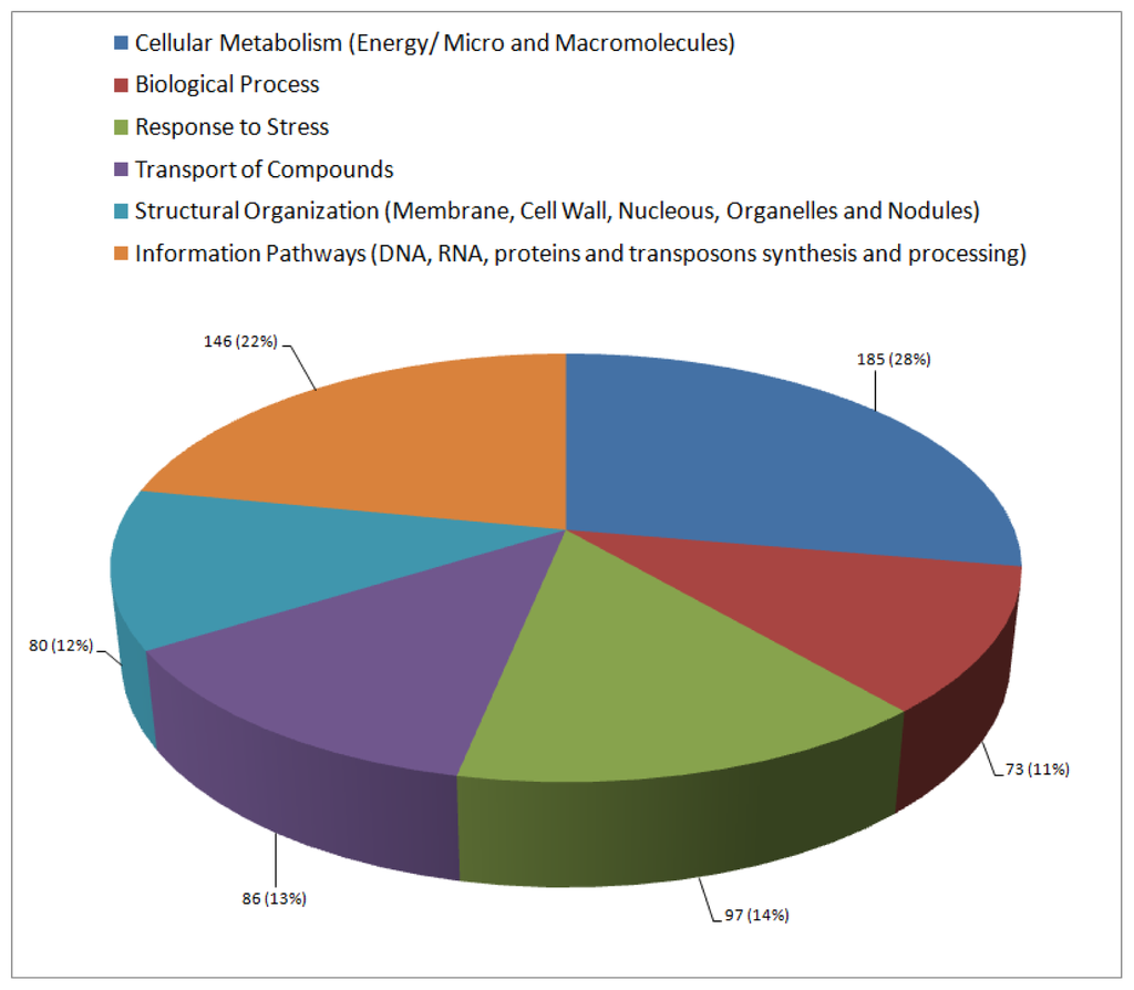 After BlastX search, 667 ESTs (59.5%) could be annotated as putative proteins, remaining 453 (40.5%) annotated as protein with unknown function or that had no homology to any sequence in the GenBank. Following that, a functional classification was carried out in order to better understand the biological processes that are enriched in the roots of the tolerant genotype of common bean in response to a drought stress. ESTs were classified into six distinct major functional classes as can be seen in Figure 2.