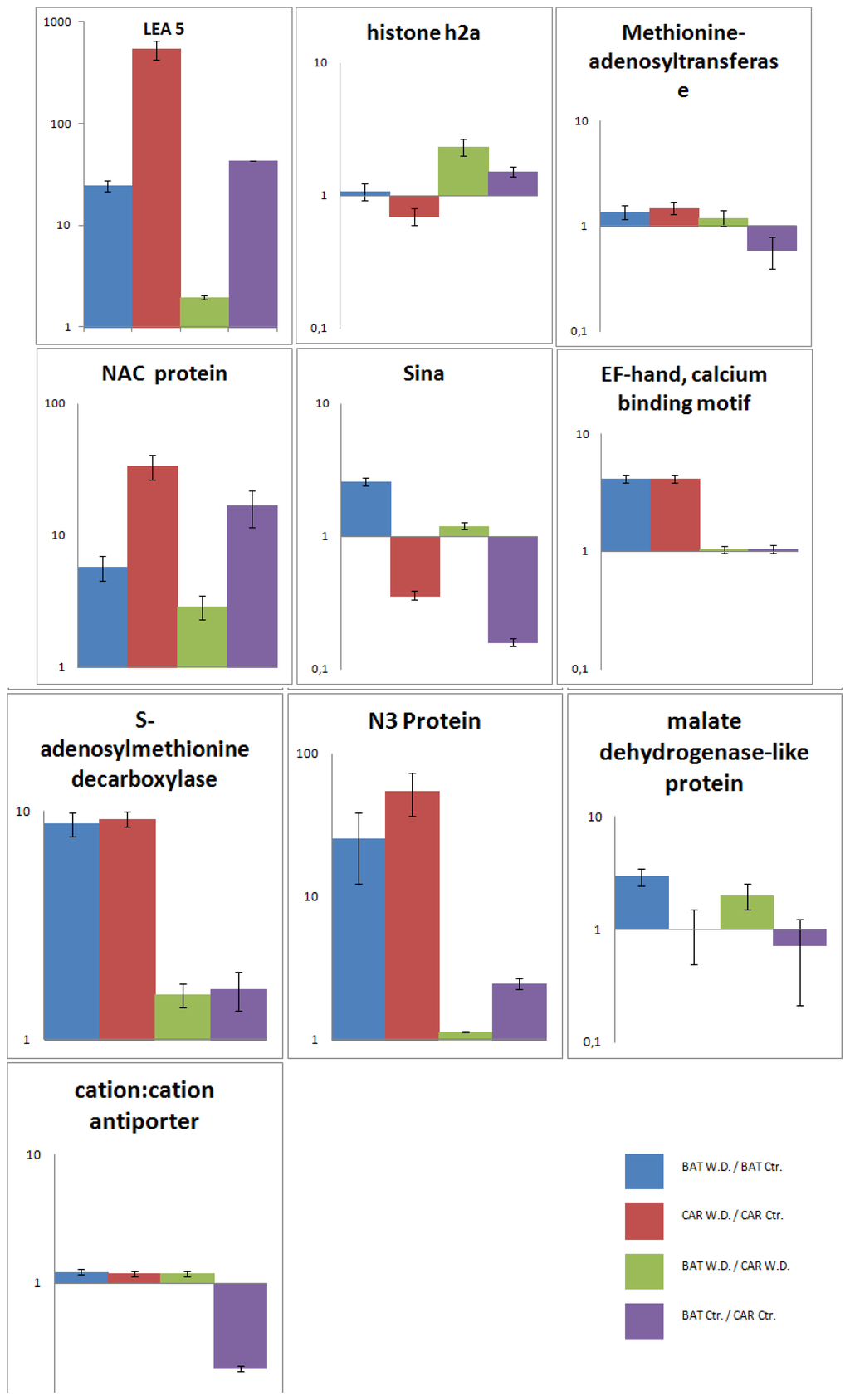 Relative Expression Levels of 10 transcripts selected for the validation assay. For each chart the columns are organized according to the following order: BAT W.D./BAT Ctr. (BAT 477 under water deficit relative to BAT 477 in control condition); CAR W.D./CAR Ctr. (Carioca 80SH under water deficit relative to Carioca 80SH in control condition); BAT W.D./CAR W.D. (BAT 477 under water deficit relative to Carioca 80SH under water deficit); BAT Ctr./CAR Ctr. (BAT 477 in control condition relative to Carioca 80SH in control condition).