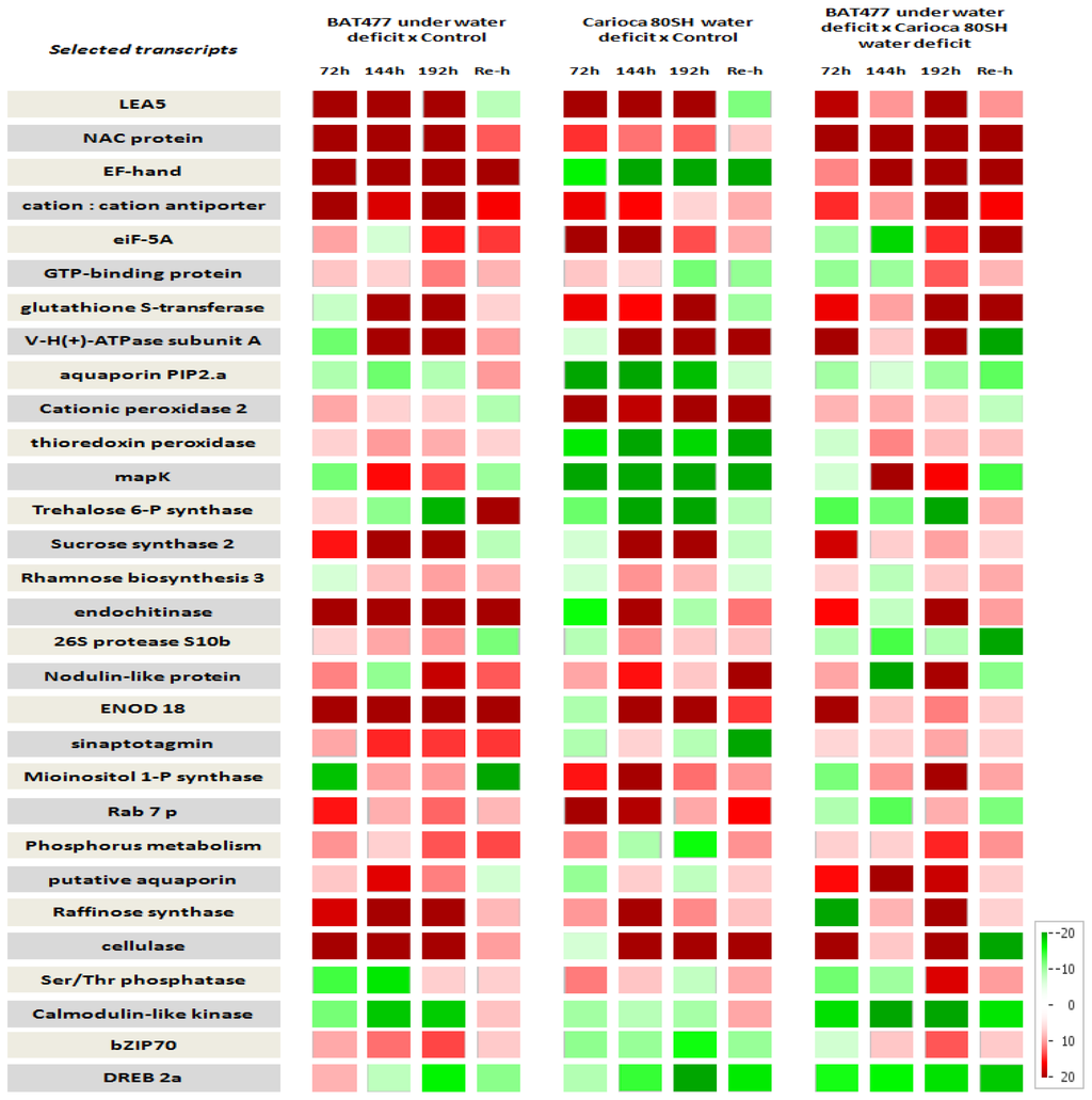 By the HeatMap shown in Figure 4, we realized that the usually expected pattern of constant and progressive up-regulation of genes through time during a stress period is not the rule, but the exception. For BAT 477, only twelve of the genes revealed this pattern (LEA5, NAC domain protein, EF-hand calcium-binding motif, mapK, sucrose synthase, rhamnose biosynthesis enzyme 3, 26S protease s10b subunit, ENOD18 factor, sinaptotagmin, raffinose synthase and cellulase), and for Carioca 80SH, only six of them (LEA5, cationic peroxidase 2, rhamnose biosynthesis enzyme 3, sucrose synthase, ENOD18 factor and cellulase). Unlike the usual pattern that is observed, there is a fluctuation in regulation with the genes up and down-regulating in relation to control conditions during the period of imposed stress.