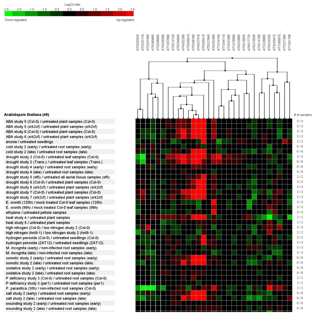The putative Arabidopsis gene orthologs (AGI numbers) obtained were used to identify probes designed for the ATH1: 22 k array Arabidopsis platform and then accessed under different stress conditions by using Genevestigator clustering analysis [50].