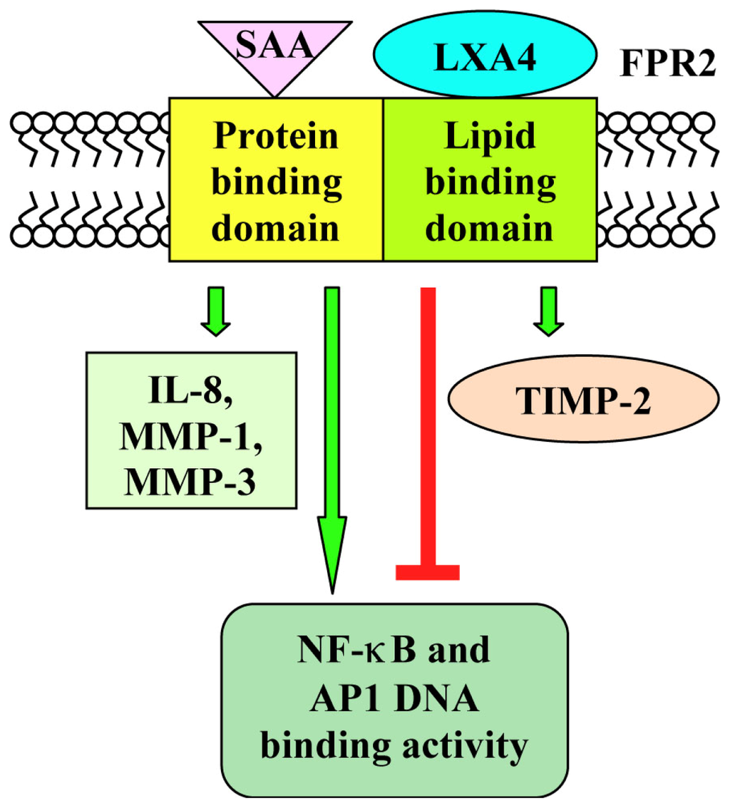 - Sodin-Semrl, S.; Spagnolo, A.; Mikus, R.; Barbaro, R.; Varga, J.; Fiore, S. Opposing regulation of interleukin-8 and Nf-kappaB responses by lipoxin A4 and serum amyloid A via the common lipoxin A receptor. Int. J. Immunopathol. Pharmacol 2004, 17, 145–156. [Google Scholar]
