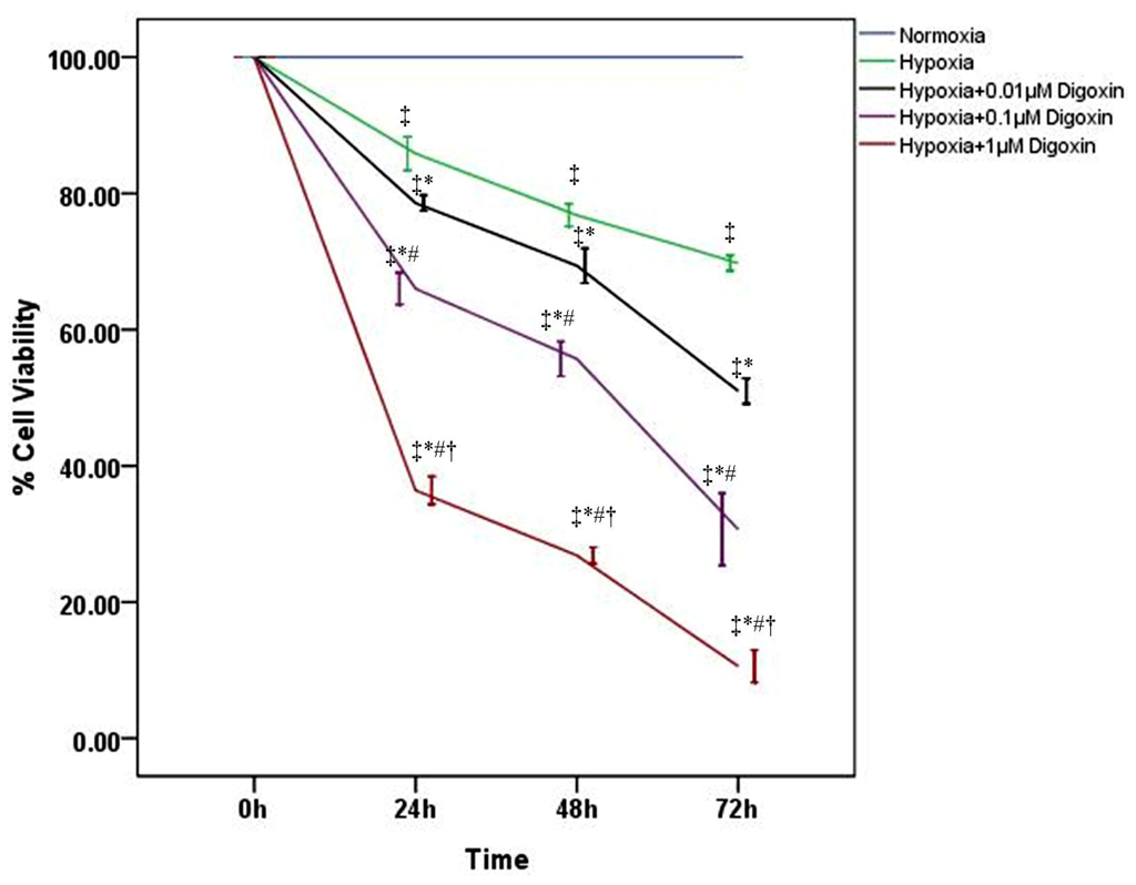 Digoxin inhibits the viability of A549 cells under hypoxic conditions. A549 cell viability was measured by MTT assay and analyzed at different time points (0, 24, 48 and 72 h) with or without various concentrations of digoxin (0.01, 0.1, and 1 μM). Quantitative data are presented as mean ± SD (n = 4). * p < 0.01 compared with hypoxia at the corresponding time points. # p < 0.01 compared with hypoxia + 0.01 μM digoxin at the corresponding time points. † p < 0.01 compared with hypoxia + 0.1 μM digoxin at the corresponding time points. ‡ p < 0.01 compared with normoxia at the corresponding time points.