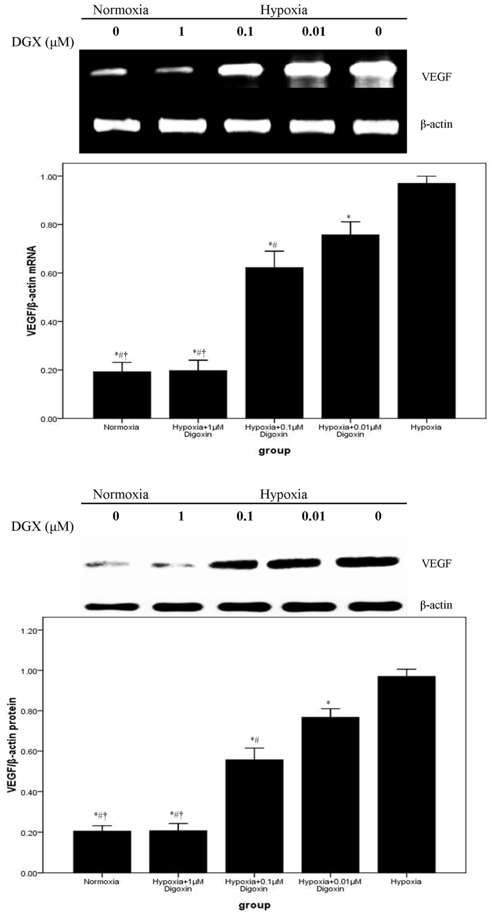 Digoxin attenuates mRNA and protein expression of VEGF in A549 cells under hypoxic conditions. Under normoxic or hypoxic conditions, mRNA and protein levels of VEGF in A549 cells treated with or without various concentrations of digoxin (0.01, 0.1, and 1 μM) for 24 h were analyzed. Quantitative data were presented as mean ± SD (n = 4). * p < 0.05 compared with hypoxia. # p < 0.05 compared with hypoxia + 0.01 μM digoxin. † p < 0.05 compared with hypoxia + 0.1 μM digoxin.