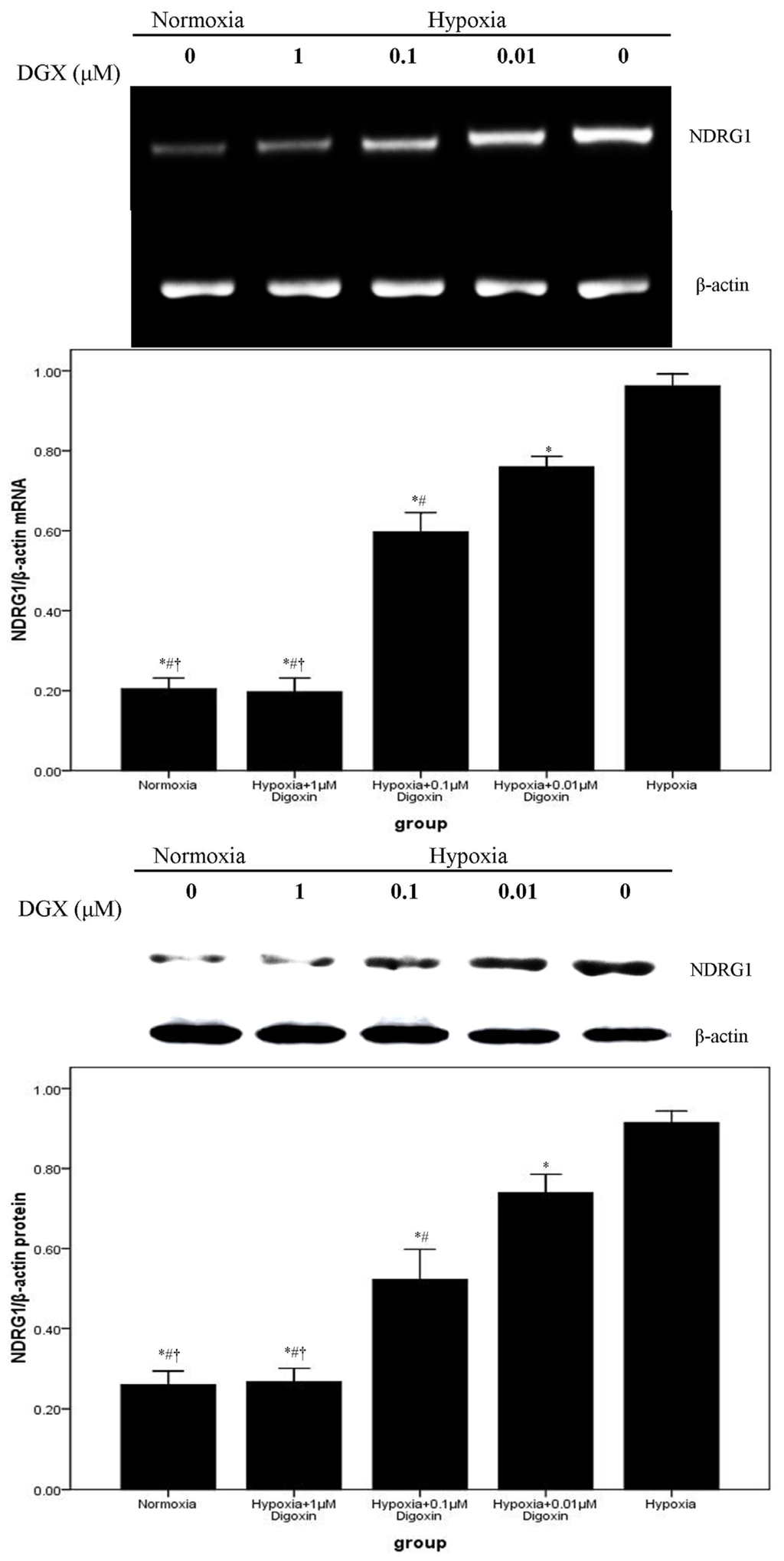 Digoxin inhibits mRNA and protein expression of NDRG1 in A549 cells under hypoxic conditions. Under normoxic or hypoxic conditions, mRNA and protein levels of NDRG1 in A549 cells treated with or without various concentrations of digoxin (0.01, 0.1, and 1 μM) for 24 h were measured. Quantitative data were presented as mean ± SD (n = 4). * p < 0.05 compared with hypoxia. # p < 0.05 compared with hypoxia + 0.01 μM digoxin. † p < 0.05 compared with hypoxia + 0.1 μM digoxin.