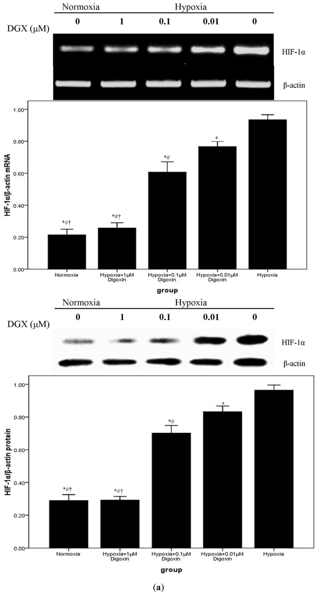 Digoxin suppresses mRNA and protein expressions of HIF-1α and reduces the HIF-1/DNA complex in A549 cells under hypoxic conditions. (a) Under normoxic or hypoxic conditions, mRNA and protein levels of HIF-1α in A549 cells treated with or without various concentrations of digoxin (0.01, 0.1, and 1 μM) for 24 h were determined. Quantitative data were presented as mean ± SD (n = 4). * p < 0.05 compared with hypoxia. # p < 0.05 compared with hypoxia + 0.01 μM Digoxin. † p < 0.05 compared with hypoxia + 0.1 μM Digoxin. (b) EMSA was used to detect HIF-1α nuclear translocation. Results shown are from 4 repeated, individual experiments. 1: Normoxia; 2: Hypoxia + 1 μM Digoxin; 3: Hypoxia + 0.1 μM Digoxin; 4: Hypoxia + 0.01 μM Digoxin; 5: Hypoxia.