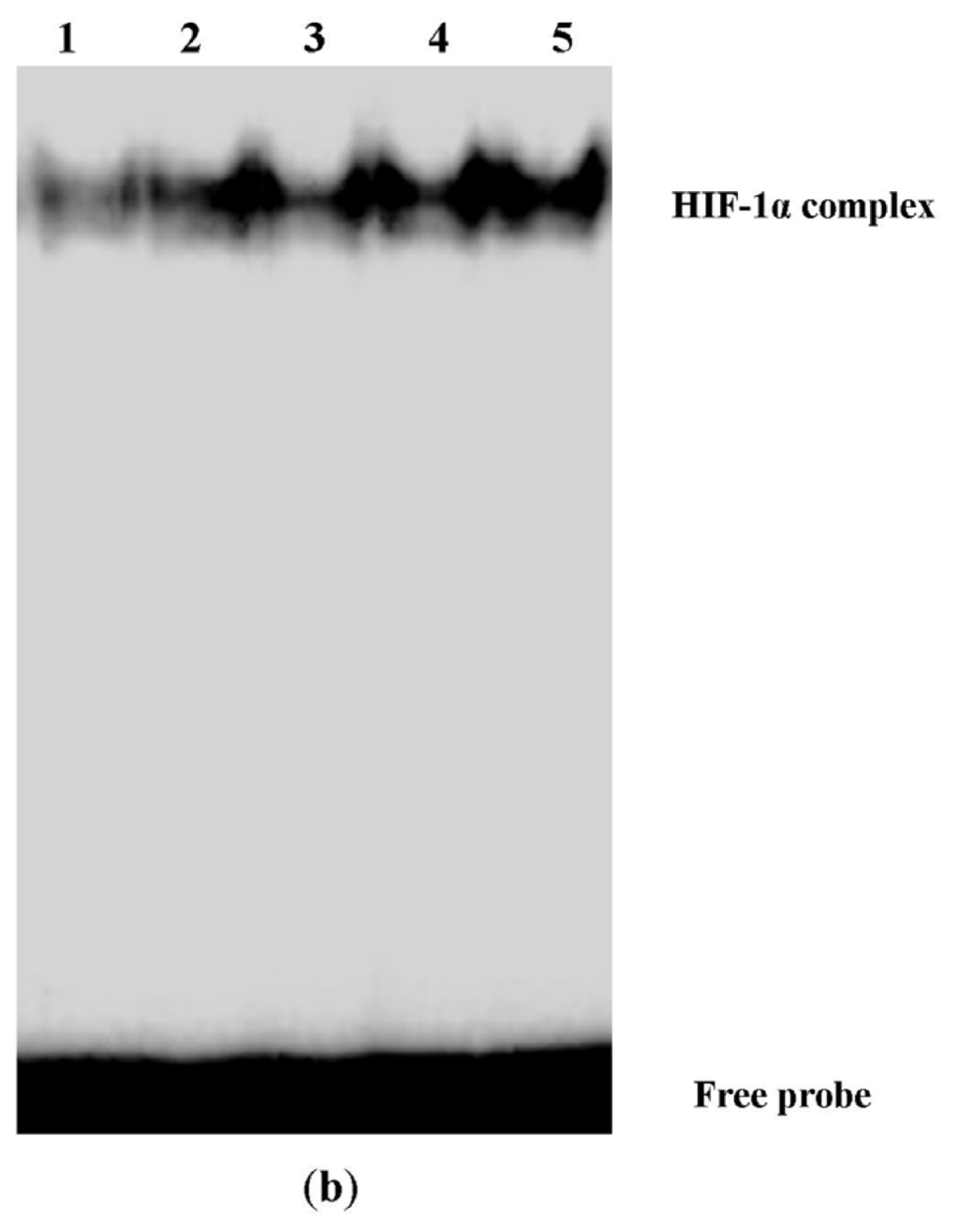 We performed RT-PCR and western blotting to determine mRNA and protein expressions of HIF-1α. Our findings indicated that HIF-1α production was markedly increased by hypoxia stimulation in A549 cells. However, hypoxia-enhanced HIF-1α production was inhibited by digoxin in a concentration-dependent manner. Moreover, as shown in Figure 4a, no difference in HIF-1α production was noted between cells subjected to normoxia and those subjected to hypoxia + 1 μM digoxin. A DNA probe derived from the promoter of the VEGF gene, including a HIF-1α binding site, was used for EMSA to discover the binding activity of HIF-1α in the nuclear extracts prepared from cells treated with or without digoxin. Our result showed that the HIF-1/DNA complex was strongly increased after exposure to hypoxia. However, under hypoxic conditions, the HIF-1/DNA complex was reduced by digoxin in a concentration-dependent manner (Figure 4b).