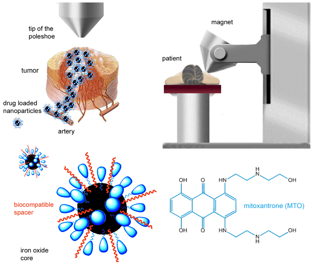 Together with surgery and radiotherapy, chemotherapy is still a mainstay of cancer treatment today. Its main disadvantage lies in the severe systemic adverse effects inherent in this mode of therapy. In order to kill tumor cells directly, anticancer drugs are usually given at the maximum dose tolerated by the patient [], which means that the dose necessary for complete tumor eradication is barely achieved. Targeted drug delivery to the tumor may overcome this dilemma [], and nanotechnology provides new possibilities in this rapidly growing medical field, e.g., in otorhinolaryngology []. Magnetic drug targeting (MDT), a new and innovative approach, has been developed to concentrate anticancer drugs in the tumor and reduce leakage into healthy tissues and cells. Superparamagnetic iron oxide nanoparticles (SPION) are functionalized with a chemotherapeutic agent, injected into the vascular supply of the tumor, and directed into the tumor itself by means of an external magnetic field (Figure 1) [].