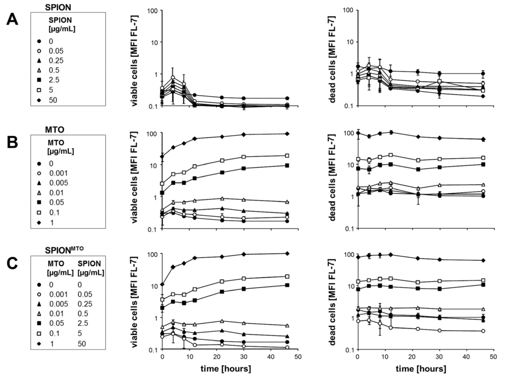 To gain information about the in vitro uptake of MTO in cell culture, we treated Jurkat cells with MTO and SPIONMTO in various concentrations and used flow cytometry to examine viable and dead Jurkat cells (Figure 3). Cells were classified as viable or dead, according to their morphological properties. SPION-treated cells, both viable and dead, exhibited only low autofluorescence. When we incubated viable cells with various concentrations of pure MTO, we found a dose-dependent increase in MFI [FL-7]. Whereas dead cells displayed a flat MFI signal over time, fluorescence increased in viable cells for at least 24 h. Most importantly, there was no relevant difference between cells incubated with pure MTO and those with SPIONMTO. The MFI signals were strongly dependent on the MTO concentration in both cases, demonstrating that MTO and SPIONMTO display similar cytotoxicity in vitro.