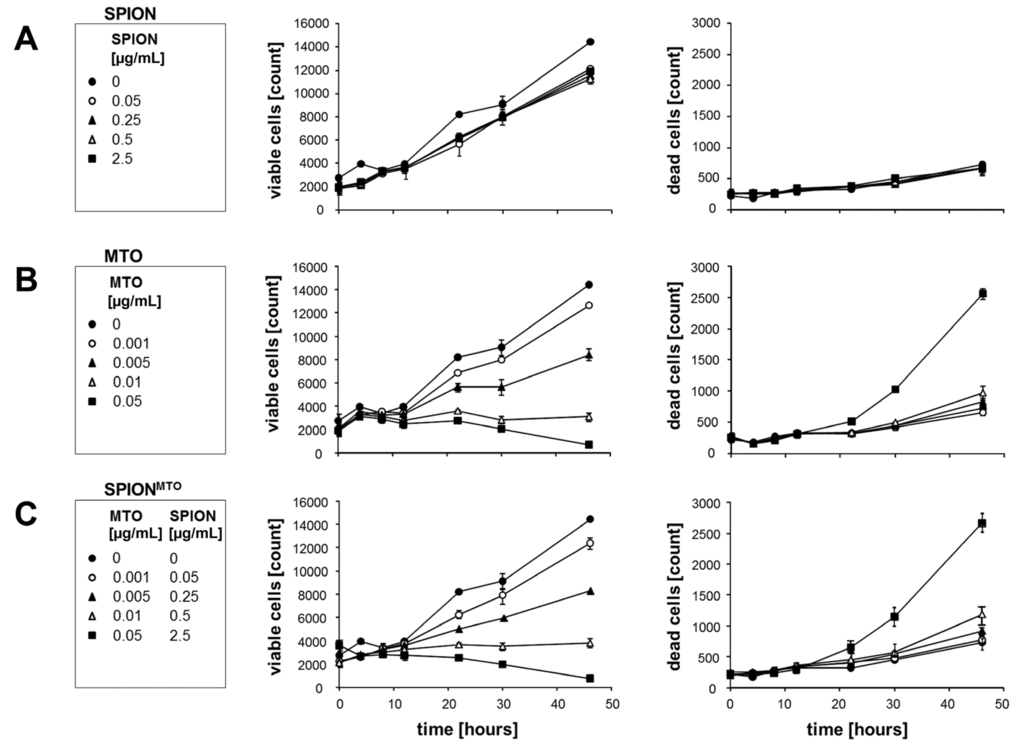Proliferation of Jurkat cells treated with superparamagnetic iron oxide nanoparticles (SPION), mitoxantrone (MTO), and MTO-loaded SPION (SPIONMTO). Viable and dead cells were distinguished according to their morphological properties (absolute values shown). (A) Pure SPION did not induce cell death in the tested concentrations; (B) Depending on the pure MTO concentration, cells showed reduced proliferation and an increased cell death rate; (C) SPIONMTO demonstrated similar behavior to MTO. Figures show the mean values of duplicates with standard deviations.