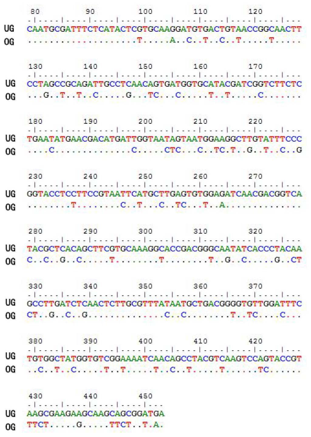 Result of sequence optimization (numbering according to the wild-type coding sequence of cyanovirin-N homology from C. thalictroides (CtCVNH)). UG: the wild-type coding sequence of CtCVNH. OG: the optimized coding sequence of CtCVNH.