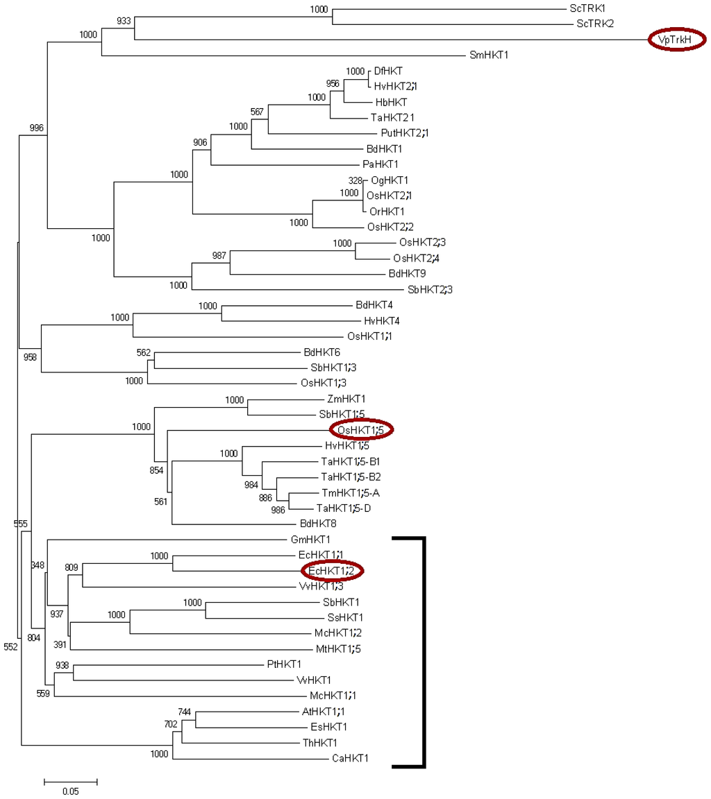 Phylogenetic analysis of plant HKT transporters. All published sequences were retrieved from the NCBI database and aligned with ClustalX2 [79]. The phylogenetic tree was constructed based on aligned protein sequences using Neighbour-Joining algorithm [80] with a Bootstrap value of 1000 using ClustalX2 [79]. The scale bar indicates the substitution rate per site. All dicotyledonous HKT entries (and none of monocotyledonous ones) are bracketed. The red circles denote proteins that are shown in Figure 2.