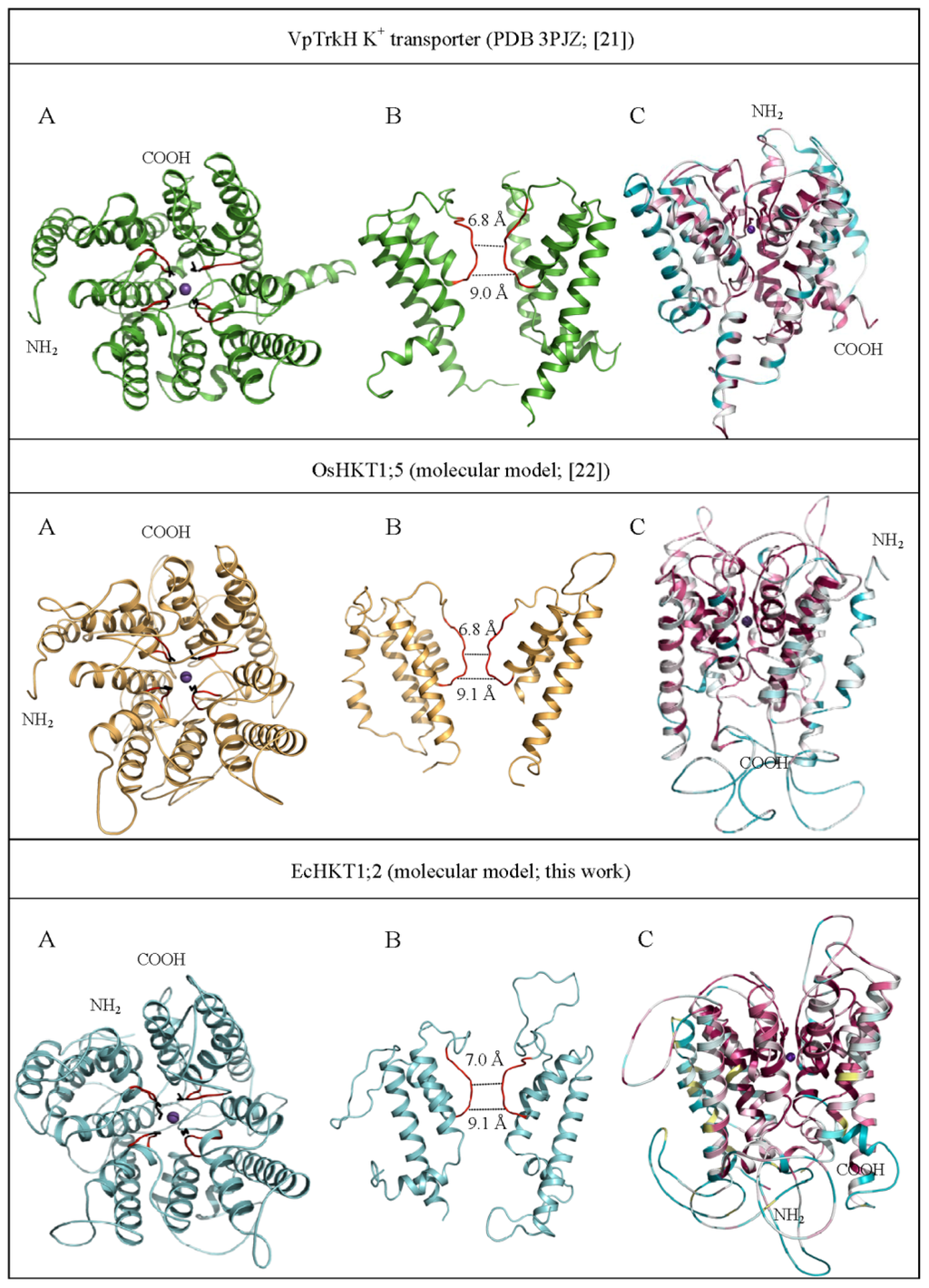 Cartoon representations of 3D structure of VpTrkH (PDB 3PJZ) (top panels) and molecular models of the Oryza sativa OsHKT1;5 (middle panels) and Eucalyptus camaldulensis EcHKT1;2 (bottom panels) transporters. (A) The overall folds of transporters are coloured in green (VpTrkH) orange (OsHKT1;5) and cyan (EcHKT1;2). Purple spheres indicate the K+ (VpTrkH) and Na+ (OsHKT1;5 and EcHKT1;2) ions. The selectivity filter signatures illustrated in black sticks are: Gly-Gly-Gly-Gly for VpTrkH and Ser-Gly-Gly-Gly for OsHKT1;5 and EcHKT1;2. The residues contained in the selectivity pores are coloured in red. These residues are likely to affect pore rigidity and dispositions of residues controlling cation selectivity and transport rates; (B) The cut-out images show geometry of selectivity pores. Their width dimensions are indicated; (C) Cartoon representations of VpTrkH, OsHKT1;5 and EcHKT1;2 colour-coded by conservation score of amino acid residues as predicted by ConSurf [81]. The views in panels C are rotated by 90° along the x-axis with respect to the views in panels A. The NH2- and COOH-termini of the transporters are shown.
