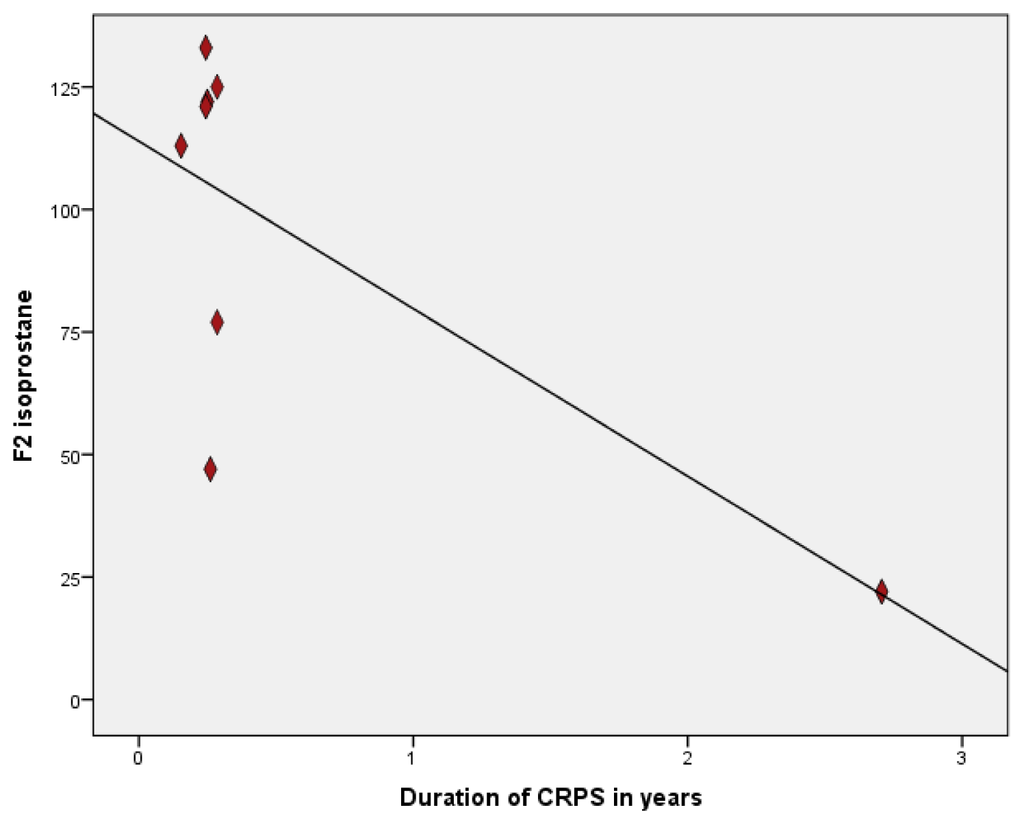 Figure 1. Correlation between levels F2 isoprostane and duration of CRPS. R = −0.72; (p = 0.04).