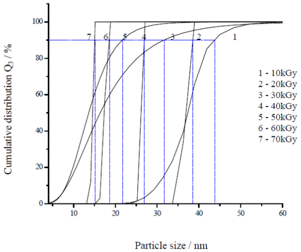 Figure 1. Cumulative distribution of particle size of monodispersed Ag nanoparticles synthesized from AgNO3 concentration of 4.2 × 10−4 M in 5 wt% PVA at different absorbed doses of (1) 10, (2) 20, (3) 30, (4) 40, (5) 50, (6) 60, and (7) 70 kGy.