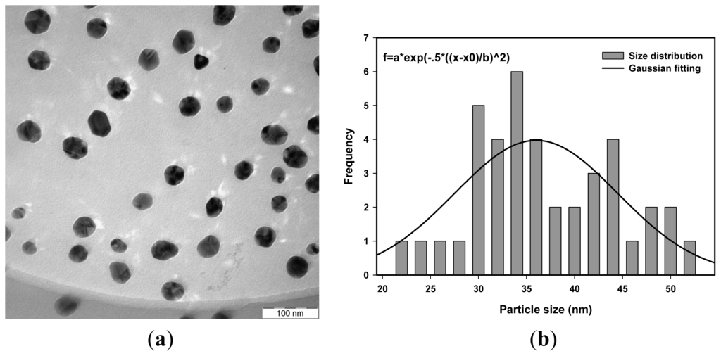 Figure 3. (a) TEM images and (b) TEM size distribution and Gaussian fitting of monodispersed Ag nanoparticles synthesized from AgNO3 concentration of 4.2 × 10−4 M in 5 wt% PVA and irradiated at 40 kGy.