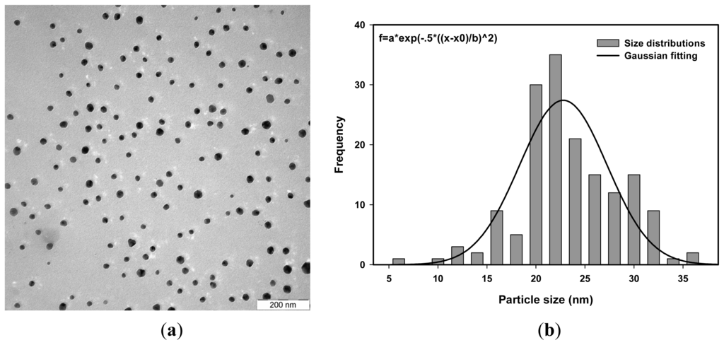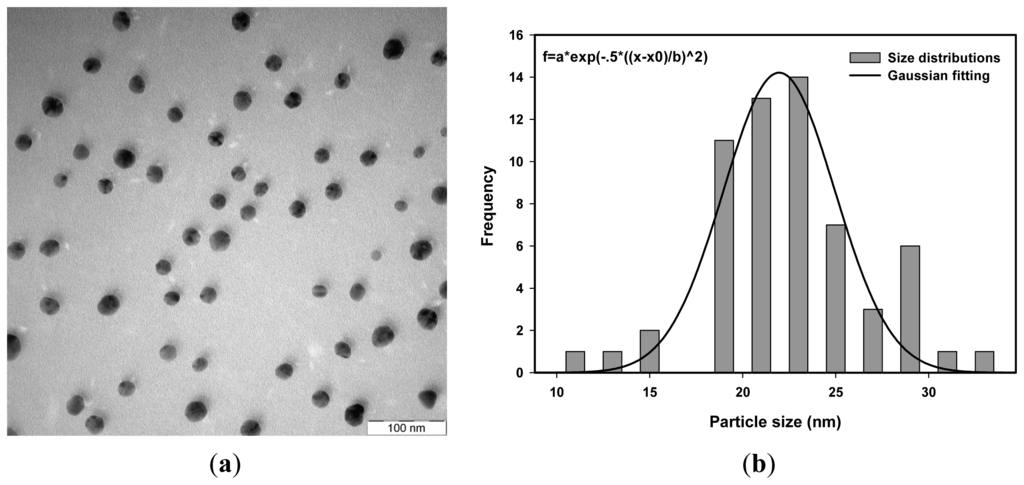 Figure 2. (a) TEM images and (b) TEM size distribution and Gaussian fitting of monodispersed Ag nanoparticles synthesized from AgNO3 concentration of 4.2 × 10−4 M in 5 wt% PVA and irradiated at 20 kGy.