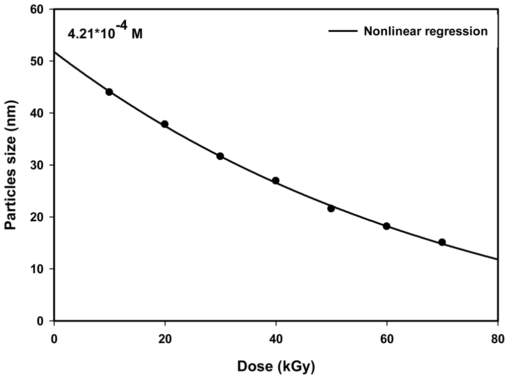 The particle size decreasing exponentially with the increasing dose may be fitted to an empirical relation of the form: