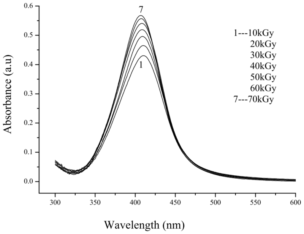 Figure 6. Sharp absorption spectra of Ag nanoparticles synthesized from 4.2 × 10−4 M AgNO3 concentration and 5 wt% PVA at different doses of 10 to 70 kGy. The absorption maximum λmax blue shifted toward lower wavelength with increasing dose owing to decreasing particle size.