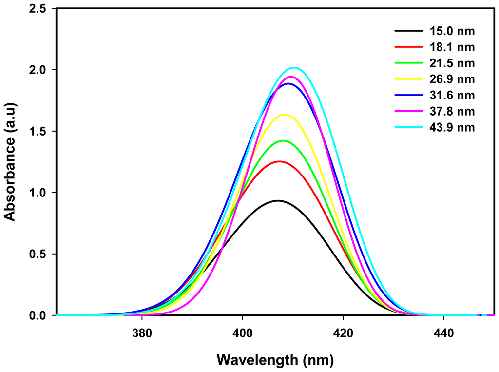 Figure 7 show the calculated absorption spectrum of Ag nanoparticles of various diameters from 15.0 to 43.9 nm imitating the measured absorption spectrum of the same diameters obtained at doses of 10 to 70 kGy. Here, for each particle size, the calculated absorption spectrum is represented by one of the possible intra-band electronic transitions. It is clear that the theoretical absorption spectrum (Figure 7) and the experimental absorption spectrum (Figure 6) are not similar in terms of the height of the maximum and the width of the peak. The reason is that the calculated spectrum is based on a single Ag nanoparticle at a given diameter, while the measured spectrum was obtained from many Ag nanoparticles of the same average diameter. Figure 7 show the height of the maximum and the width of the peak of the calculated spectrum increase with increasing particle size and also the absorption maximum red shifted with increasing size. For the larger particle sizes, the number of atoms required to make up the nanoparticles is enormous, so the number of conduction electrons used in the computation is more than those of smaller particle sizes and this increases the height of the maximum and the width of the peak. The most important information between the theoretical and experimental results is that the simulated absorption maximum, λmax consistent with the measured values as shown in Table 2. The results indicate that the absorption spectrum of Ag nanoparticles (Figure 6) most likely originated from the intra-band electronic excitations of conduction electrons from the lowest energy state of quantum numbers (n = 5; l = 0) to higher energy states of quantum numbers (n ≥ 6; Δl = 0, ±1; Δs = 0, ±1) within the conduction band of Ag nanoparticles.