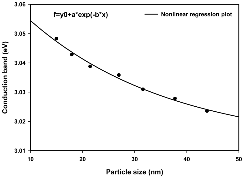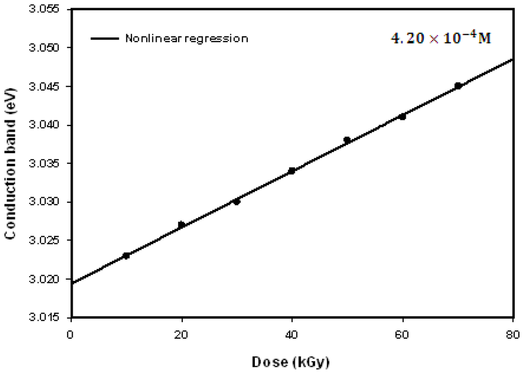 The conduction band energy, E of Ag nanoparticles may be calculated according to E=hcmax, where h is the Planck’s constant, c the speed of light, and λmax the wavelength of the absorption maxima. The conduction band energy represents the amount of energy required to excite the conduction electrons from the lowest energy state to higher energy states influenced by the UV-visible electromagnetic radiation. Figure 8 shows the nonlinear relationship between the conduction band and the dose. The absorption maximum λmax blue shifted toward lower wavelength from 410 to 407 nm with increasing dose, corresponding to conduction band of 3.023 to 3.045 eV, respectively. This is the result of decreasing particle size from 43.9 nm at 10 kGy to 15.0 nm at 70 kGy. For smaller particles, the number of atoms to make up the nanoparticles is few, so that conduction electrons are less attracted to protons of the Ag nanoparticles and, consequently increase the conduction band and decrease the absorption peak of Ag nanoparticles.