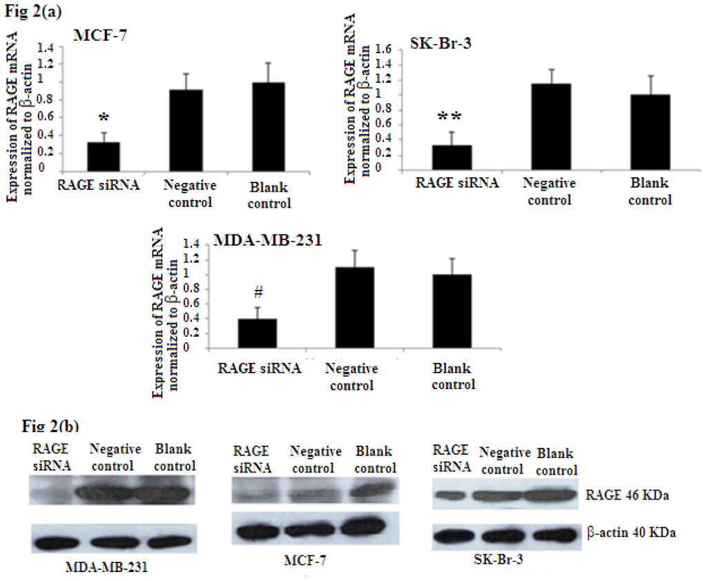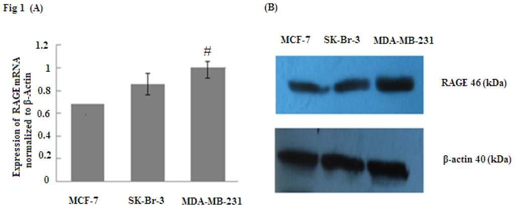 RAGE plays an essential role in the modulation of cancer cell functions when it is overexpressed through increasing tumor invasion and metastasis. To determine whether RAGE is overexpressed in breast cancer, RAGE mRNA was evaluated by quantitative real time PCR (qRT-PCR) and RAGE protein was detected by Western Blot. The results indicated that MCF-7, SK-Br-3 and MDA-MB-231 cell lines expressed RAGE mRNA and protein; however, MD-MBA-231(aggressive sub-type) expressed significantly higher levels of RAGE than SK-Br-3 and MCF-7 (# p < 0.05) (Figure 1). Thus, our results suggest that RAGE overexpression is closely associated with breast cancer.