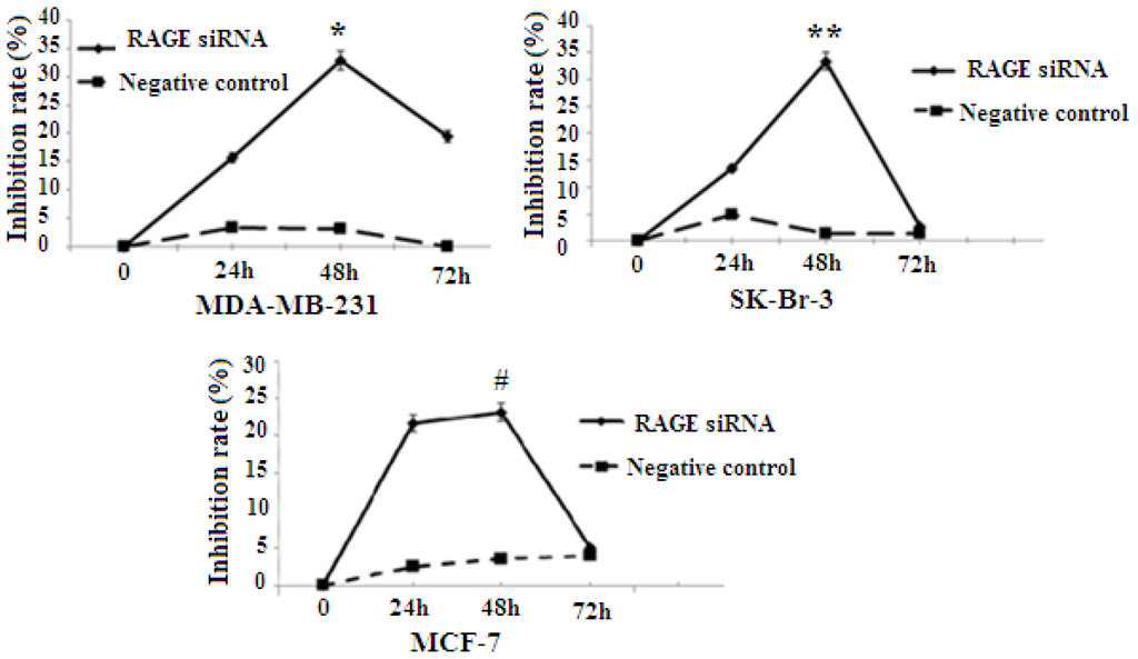 The cell proliferation assay was performed with 3-(4,5-Dimethylthiazol-2-yl)-2, 5-Diphenyltetrazolium Bromide (MTT). MCF-7, SK-Br-3, and MDA-MB-231 cells cultured in 96-well culture plates were transfected with the siRNA as described previously. The cells were then incubated at 37 °C and 5% CO2 for 0, 24, 48, and 72 h. At the end of each incubation interval, the cells were washed with PBS buffer, and 10 μL of (5 mg/mL) MTT solution (MTT Cell Proliferation and Cytotoxicity Assay Kit, Beytime, Shanghai, China) was added into each well. The plates were incubated for 4 h at 37 °C and 5% CO2. Then, the MTT solution was removed and 150 μL of Formazan was added into each well for 20–30 min. Finally, the absorbance (A value) was measured using a micro-culture plate reader at 490 nm. The cell proliferation inhibition rate by RAGE siRNA was calculated according to the following equation: inhibition rate = [(absorbance value of group1 at 490 nm) − (absorbance value of group 2 at 490 nm)/absorbance value of group 1 at 490 nm] × 100. Each assay was performed in triplicate, and the average absorbance was calculated.