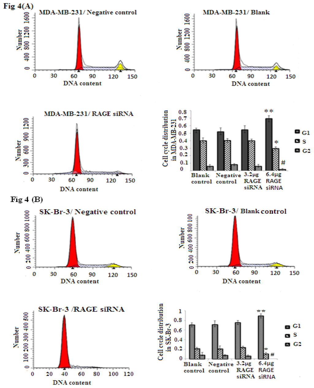 In this study, we demonstrated for the first time that knockdown of RAGE in different sub-types of breast cancer cell lines has a profound effect on proliferation, as shown by MTT assay, and the effect was more significant after 48 h of transfection with RAGE siRNA. This was supported by a significant increase in the number of cells in the G0/G1 phase combined with a decrease in the number of cells in the S and G2 phases. Cell cycle arrest in the G1 phase in MDA-MB-231 and SK-Br-3 (the high and moderate RAGE expressers, respectively) required only a low concentration of siRNA compared to MCF-7 (the low RAGE expresser), which required a higher concentration of siRNA to achieve the significant result. On the other hand, there was significant elevation of biosynthesis and percentage of cell proliferation of the blank controls cells (at S + G2 phases) in the MDA-MB-231 (45%) compared to MCF-7 (29%) and SK-Br-3 (29%). This confirms that the effect of RAGE siRNA on the high RAGE expressing cell line, MDA-MB-231 (which also shows high proliferation), is greater than its effect on the low RAGE expressing cell line, MCF-7 (which also shows low proliferation). If suppression of RAGE by siRNA is feasible and efficient in mouse tumor models, it may facilitate the development of RNA-interfering based therapies. This type of therapy could be more effective if adjuvant with chemotherapy or radiotherapy, which affects cells in cell cycle G0 to G1 [].