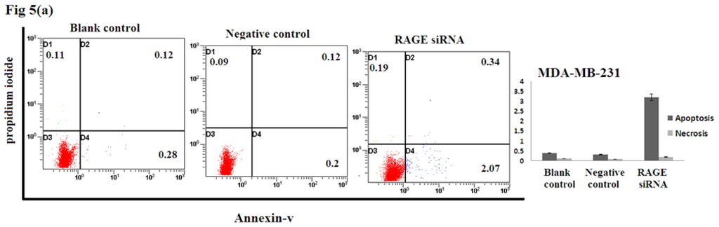 Apoptosis assay of transfected breast cancer cell lines by RAGE siRNA investigated using Flow Cytometry. No significant difference of Annexin-V-positive apoptotic cells was detected in the RAGE siRNA-treated group compared to control groups as shown in Figure 5, suggesting that RAGE knockdown may not induce apoptosis of breast cancer cells.