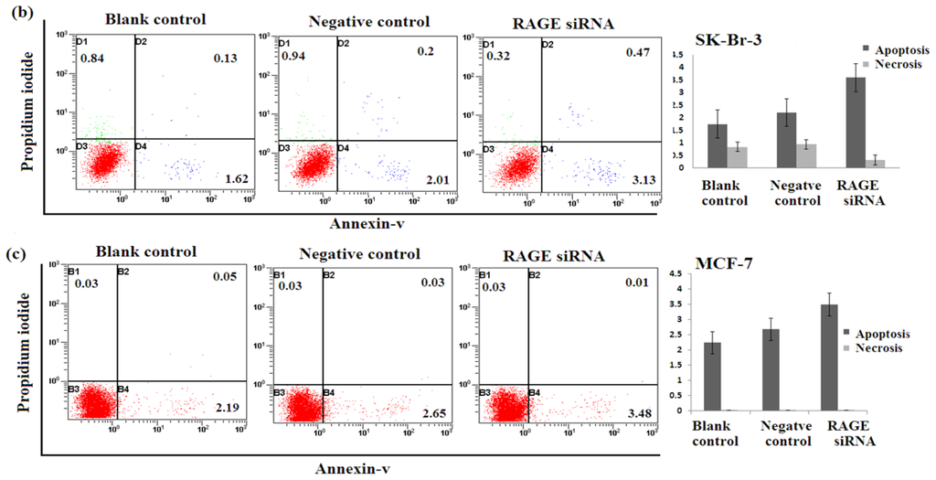 Effect of RAGE siRNA on apoptosis of (a) MDA-MB-231; (b) SK-Br-3; (c) MCF-7 breast cancers cell lines. Transfected cells were stained with Annexine-V and Propidium iodide followed by flow cytometry. Early apoptotic (right bottom), late apoptotic (right top) and necrotic (left top) cells were displayed. Three independent measurements were performed and averaged and no significant difference was detected.