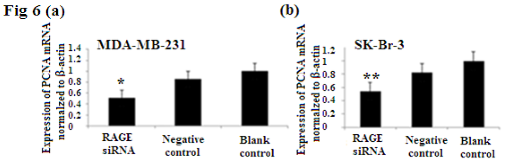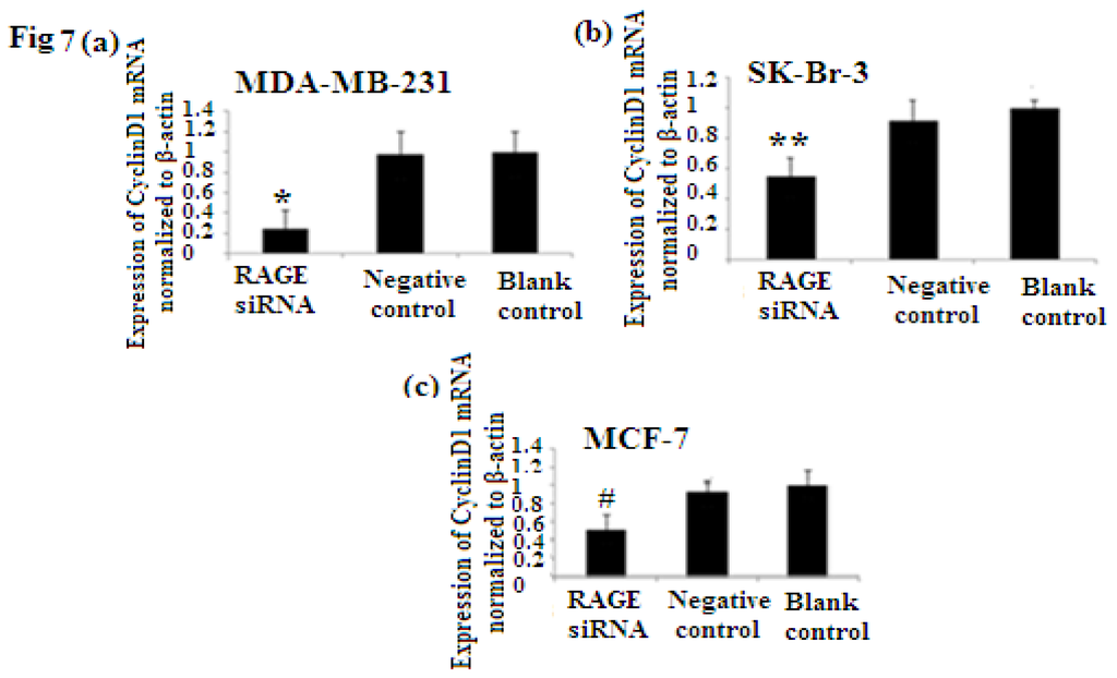 PCNA (proliferation cell nuclear antigen) is a 36-kilodalton nuclear protein synthesized in the G1/S–phase of the cell cycle and functions as a cofactor for DNA polymerase delta, which is associated with DNA synthesis and repair [,]. It is involved in cell cycle regulation and check point control []. CyclinD1 is a protein involved in normal cell cycle regulation and is responsible for the transition from the G1 (resting) phase to the S (DNA synthesis) phase. Both PCNA and cyclinD1 are important for the regulation of cell division. qRT-PCR and Western Blot results indicated that RAGE siRNA significantly decreased the expression of PCNA and cyclinD1 mRNA in MCF-7, SK-Br-3 and MDA-MB-231 cells (p < 0.5) (Figures 6 and 7).