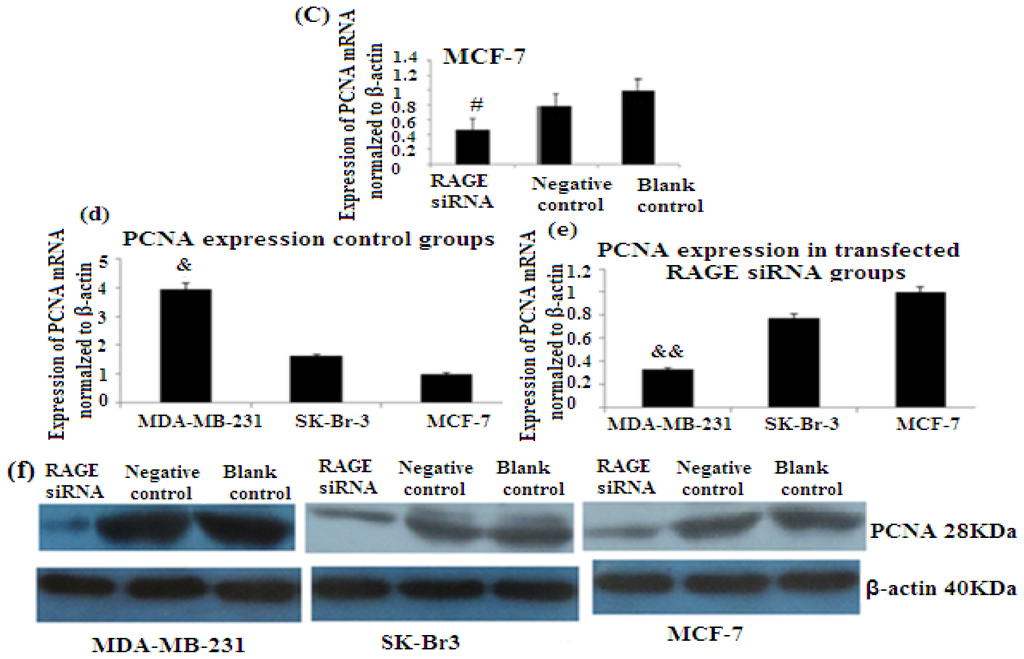 There was decreased expression of PCNA mRNA after transfection with RAGE siRNA as shown by qRT-PCR in MDA-MB-231 (a), SK-Br-3 (b) and MCF-7 (c) cell lines respectively (*, **, # p < 0.05) and Western Blot results (f) (p < 0.05) compared to the negative or blank control groups. Comparison between the expression of PCNA in the three cell lines in the control groups (d) and in the transfected groups (e). Three independent measurements were performed and averaged.