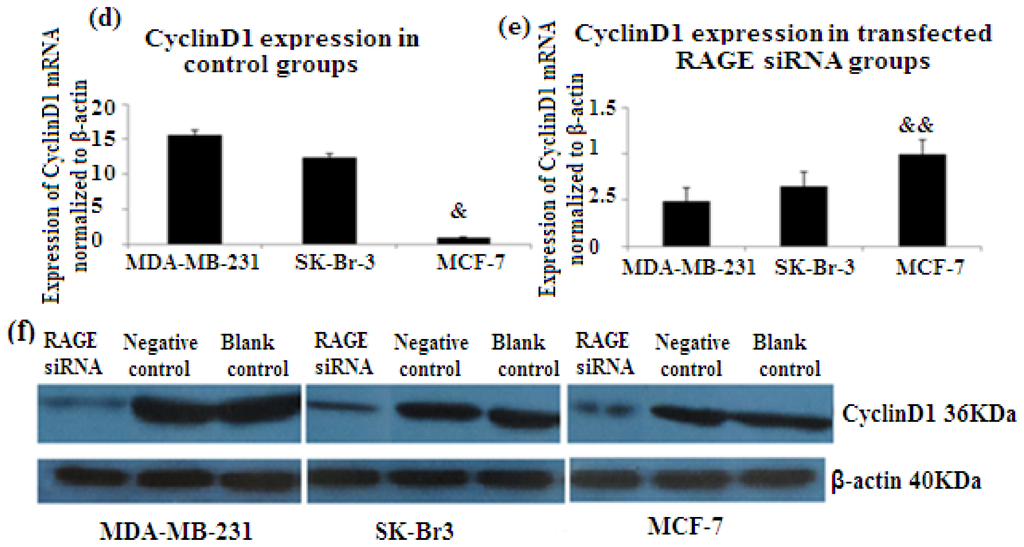 There was decreased expression of CyclinD1 mRNA after transfection with RAGE siRNA as shown by qRT-PCR in MDA-MB-231 (a), SK-Br-3 (b) and MCF-7 (c) cell lines respectively (*, **, # p < 0.05) and Western Blot results (f) (p < 0.05) compared to the negative or blank control groups. Comparison between the expression of CyclinD1 in the three cell lines in the control groups (d) and in the transfected groups (e). Three independent measurements were performed and averaged.