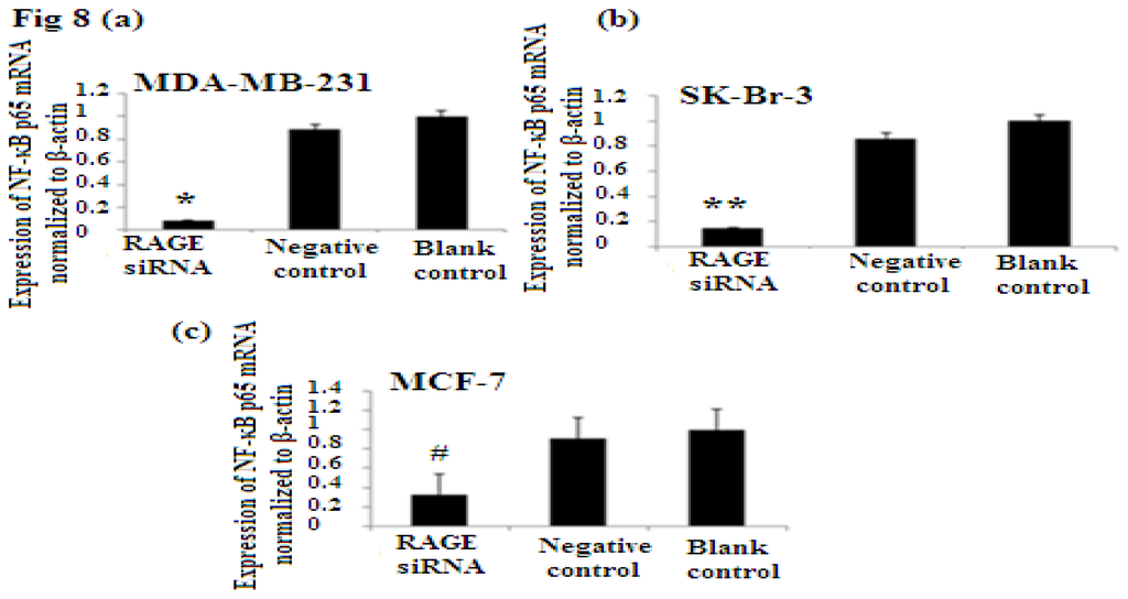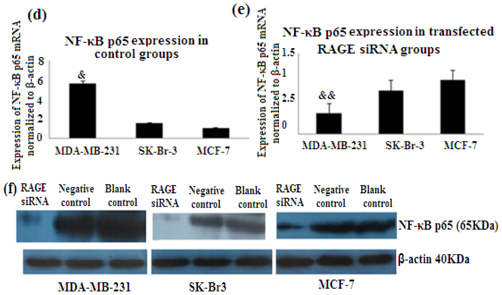 There was decreased expression of NF-κB p65 mRNA after transfection with RAGE siRNA as shown by qRT-PCR in MDA-MB-231 (a), SK-Br-3 (b) and MCF-7 (c) cell lines respectively (*, **, # p < 0.05) and Western Blot results (f) (p < 0.05) compared to the negative or blank control groups. Comparison between the expression of NF-κB p65 in the three cell lines in the control groups (d) and in the transfected groups (e). Three independent measurements were performed and averaged.