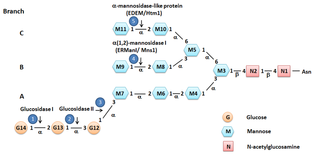 Misfolded proteins that fail to achieve their native state are degraded by the ERAD system. Glycoproteins are extracted from the UGGT/CNX/CRT/GII cycle after removal of the outermost mannose (M9) on branch B by the ER localized α(1,2)-mannosidase I (ERManI/Mns1 in mammals/yeast) [13] (Figures 1 and 2). Compared to the other reactions, this step can be slow, allowing misfolded proteins to undergo additional rounds of protein folding. If the glycoprotein is still not properly folded after additional rounds of folding, the outermost mannose (M11) on branch C is removed by the ER degradation-enhancing α-mannosidase-like proteins (EDEMs/Htm1, in mammals/yeast) and targeted to the ERAD system (Figures 1 and 2).