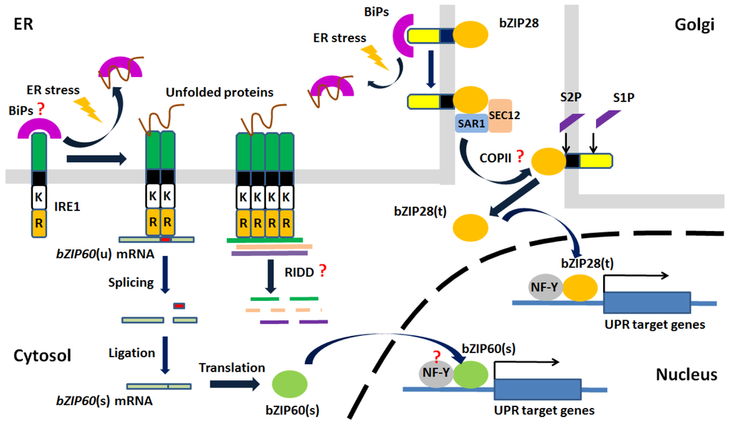 Figure 3. The unfolded protein response in Arabidopsis. Arabidopsis plants have two arms of the ER stress signaling pathway, an arm involving the proteolytic processing of membrane-associated basic leucine zipper domain (bZIP) transcription factors (TFs) and an arm involving RNA splicing factor, IRE1. The membrane-associated bZIP TFs, having a cytosol-facing TF domain, a single transmembrane domain and a canonical S1P site on their lumen-facing domain, are translocated to Golgi (by some means likely involving the COPII vesicle machinery; red question mark) and proteolytically processed by site-1 protease (S1P) and site-2 protease (S2P) in response to ER stress. The cytoplasmic components of the released TFs (e.g., bZIP28(t)) enter the nucleus and activate unfolded protein response (UPR) target genes together with CCAAT-box binding proteins composed of NF-Y subunits. Upon ER stress, IRE1 splices bZIP60 mRNA, causing a frameshift leading to the synthesis of a TF without a transmembrane domain, but having acquired a nuclear targeting signal. The spliced form of bZIP60 (bZIP60(s)) is imported into the nucleus to activate UPR target genes. On the other hand, recent studies suggested that IRE1-dependent decay (RIDD) of specific mRNAs may also occur in Arabidopsis (red question mark). It is important to note that it is still unknown whether the activation of IRE1 and bZIP17/bZIP28 involve the disassociation of BiPs and whether bZIP60 functions as a TF together with NF-Y complexes (red question marks). K, kinase domain; R, RNase domain.