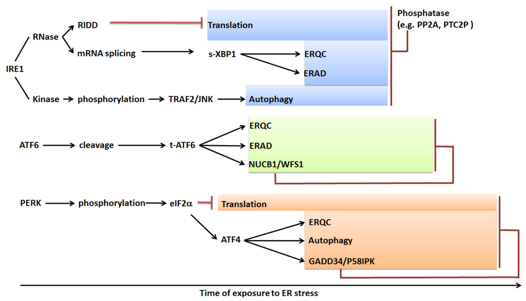 Figure 4. Hypothetical time course of the unfolded protein response in mammals. It has been proposed that the translation repression by PERK and IRE1-dependent decay (RIDD) occur early in response to ER stress, followed by ATF6-induced upregulation of ERQC and ERAD related genes. The upregulation of UPR target genes by XBP1 and PERK-ATF4 occurs next, since the activation of XBP1 and ATF4 themselves also require de novo protein synthesis. The responses in all three arms of the UPR undergo attenuation after the onset of stress, even under continuous stress conditions. While the IRE1 response attenuates quickly within eight hours through phosphatase-regulated IRE1 dephosphorylation, the ATF6 activation response lasts for about 20 h and, then, is suppressed by its own induced NUCB1 and WFS1. On the other hand, the PERK-mediated response persists even after 30 h and finally attenuates through eIF2α dephosphorylation regulated by GADD34/P58IPK, which are also induced by the PERK pathway itself.