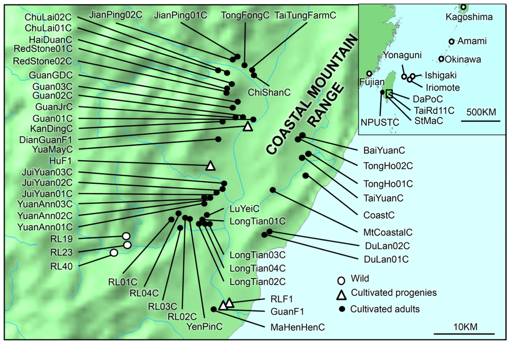 Map of sampling sites in this study. The large panel indicates the sampling sites of C. taitungensis in the southeast Taiwan and the upper-left panel indicates the sampling sites of C. revoluta. Wild populations, cultivated adults and progenies are marked in hollow circles, full circles, and hollow triangles, respectively. Codes of the sampling sites correspond to Table A1.