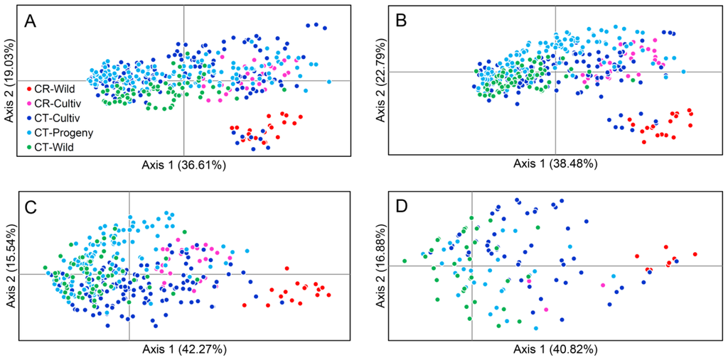 The first two axes plots of principle coordinate analysis (PCoA) calculated using (A) 262 neutral loci; (B) 91 species-associated loci determined under criteria LOD 3.0; (C) 23 species-associated loci determined under criteria LOD 6.0; and (D) 10 species-associated loci of the linkage subgroup 1 under criteria LOD 6.0. Abbreviations CR ad CT indicate C. revoluta and C. taitungensis, respectively; Wild, Cultiv, and Progeny indicate the wild populations, the cultivated adults, and the cultivated seedlings, respectively.
